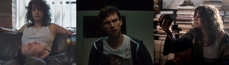 At first glance, Hellraiser has much in common with another horror remake, Evil Dead (Álvarez, 2013). Not only is it more of a “re-imagining” of the source material, but the main plot revolves around a damaged, recovered addict. Riley McKendry has wasted most of her life to drink and drugs but, after putting her brother, Matt, his boyfriend, Colin (Faison), and their friendly roommate, Nora (Aoife Hinds), through hell with her mood swings and antics, she’s finally on the right path towards sobriety. However, for the long-suffering Matt, there’s still a problem: Riley’s boyfriend, Trevor (Starkey), who she met while going to group therapy and following the “12 Step” program. Not only is Matt immediately suspicious of Trevor because of this and because he so obvious looks like a drug dealer and user, he’s also worried that Riley mixing with a recovering addict will only drag her down when Trevor inevitably relapses. Riley naturally lashes out against Matt’s judgements; whatever trauma drove her to addiction is clearly deep-rooted within her and she latches onto Trevor as a source of escape and sexual comfort. Indeed, when Matt suddenly vanishes after being cut by the mysterious puzzle box, the first thing Riley does is find comfort in Trevor’s arms and it’s in him, not her friends, that she confides in and turns to to help her figure out what the deal is with the box. Speaking of which, it’s Trevor’s fault the puzzle box even ends up in Riley’s hands in the first place. When she mentions that she needs to find a “better job” to start paying her share of the rent and get Matt off her back, Trevor encourages her to help him break into an abandoned warehouse and swipe whatever’s inside, said to belong to some rich asshole, and split the profits. Unfortunately for her, and all of them, what they find is a strange, gold-and-brass puzzle box that immediately enthrals Riley. However, when she returns home drunk and gets into a blazing row with Matt, her brother finally snaps and throws her out, leaving her wandering the city streets late at night in an alcohol and pill-fuelled daze.