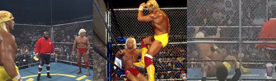 It’s probably controversial to say but I’ve never been much of a fan of Ric Flair. I think it’s mainly because he’s always been from a bygone era and his peak was way before my time as a wrestling fan, when the grounded style and presentation was notably different not just to today but to when I started watching wrestling in the nineties. I’m a little more lenient on Hulk Hogan simply because he’s a larger-than-life icon of the industry but I’ve never been massively wowed by his matches as he had a very limited repertoire and very rarely deviated from what worked, meaning I find his matches quite repetitive. However, I will say that much of my exposure to both men was when they were in the heyday of their careers and wrestling in an extremely limited capacity, so a part of me is interested in seeing more from both men at their peak and against a contextual background the plays into their strengths, and even I can’t deny that Hogan vs. Flair was the match of the wrestling industry back in the day. Flair was the first to enter the arena for this long-awaited match. Accompanied by “Sensuous” Sherri and draped in one of his trademark robes, Flair exuded the pomp and grandeur of the classic wrestling heel from head to toe. In comparison, Hogan was his usual bombastic self; played to the ring by his awful “American Made” theme and accompanied by Jimmy Hart and Brother Bruti (all of them garbed in Hogan’s signature garish red and yellow). Hogan pandered to and posed with the crowd in the epitome of the beloved, indomitable wrestling babyface. In addition to Michael Buffer running down each man’s lengthy list of accomplishments, Tony Schiavone and Bobby Heenan emphasised that both men had made an indelible mark on the industry and cemented themselves as icons of the business, and to really hammer home that this match would spell the end of one of their legendary careers. Interestingly, the flimsy, rickety wireframe cage was lowered around the ring after the competitors entered, making for an unsettling visual as the ring crew scrambled to get it secured, though this ultimately milked the anticipation of the crowd as was common for Hogan matches. Also, the cage wasn’t really built or tall enough for climbing; it was simply a frame to keep both men in and ensure a decisive victory by pin fall or submission.