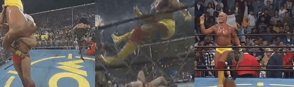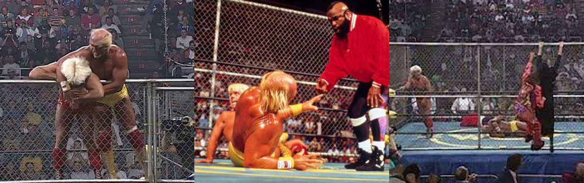 The two superstar icons exchanged chops and blows in the corner, and Flair frantically tried to escape the cage when he realised he couldn’t win the slugfest. Hogan followed, however, and assaulted the Nature Boy using the cage before causing Flair to drop crotch-first onto the ring ropes. However, Hogan’s renewed aggression was shut down with a boot to the face and put him at risk of the Figure Four, though the champion countered into a roll-up for a near fall. When Flair tried to stun Hogan with some knife edge chops, the Hulkster simply shrugged it off and started “Hulking Up”. He crushed Flair’s hand, ran him into the cage wall once more and then started grating Flair’s forehead on the mesh. A back suplex scored Hogan a two count and, as Hogan again argued with Mr. T (who, the commentators admitted, wasn’t a professional referee so didn’t have the best technique), Flair again tried to escape. This time, Hogan repeatedly smashed Flair’s head off the mesh and hit him with a barrage of chops, only for Flair to shut down his momentum with a knee lift and a couple more running knee drops, this time to Hogan’s weakened leg. Flair continued to work over the leg and wrench at Hogan’s knee, again causing him to butt heads with Mr. T, before finally slapping on the Figure Four Leglock. The crowd, Jimmy Hart, and Bobby Heenan were whipped into a frenzy as Hogan writhed in the hold before mustering the strength to power out of it and to his feet, but Mr. T accidentally took a bump during Hogan’s big comeback. Frustrated, Ric Flair kicked at Mr. T and Sherri tried to climb into the ring to help Flair out. Although Jimmy Hart succeeded only in exposing her ass to the audience, Sting intercepted her and got clobbered from behind by a masked man wielding a steel pipe.