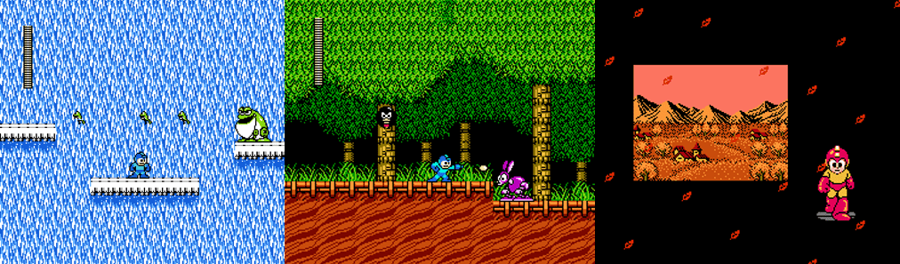 A whole host of new robotic enemies awaits you in Mega Man 2, though there are a couple of familiar faces here: Neo Metall hides behind its hard hat and fires projectiles like its predecessor but is bold enough to rush you, too. A renewed Sniper Joe also returns, still hiding behind a shield but now staying completely still. However, they make up for this by controlling giant mech walkers that almost act like mini bosses unless you have the Air Shooter or Leaf Shield. Similarly, you’ll encounter gigantic robotic Lantern Fish in Bubble Man’s stage. These perpetually spit out shrimp-like Shrink’s and can only be destroyed by shooting the lure on its head. Another gigantic quasi-mini boss are the Hot Dogs encountered in Wood Man’s stage; while they don’t move, they breathe plumes of fire that are difficult to avoid in the cramped tunnels. Most other enemies can be destroyed in one or two shots and are largely more manageable compared to the first game, though the constant respawning can be a headage. Bubble Bats, crab-like Claws, Tellys, and Springers are all commonplace and good for farming ammo or health, while Crabbots, Robo-Rabbits, and Pierobots can cause some headaches due to their small size, versatile firing range, and suddenness of their appearance, respectively. Enemies like Croaker, Pipi, and Blocky should be taken out quickly to avoid them spewing up smaller enemies or spreading themselves as projectiles. Air Tikkis and Lightning Lords act as platforms in Air Man’s stage, where Fan Fiends blow you back, and Crazy Cannons shoot at you through the environment. I was very impressed by the visual variety and character in Mega Man 2’s enemies, with guys like the speedy Atomic Chicken, Hothead, and Mecha Monkey being fun standouts for their large sprites and toughness.