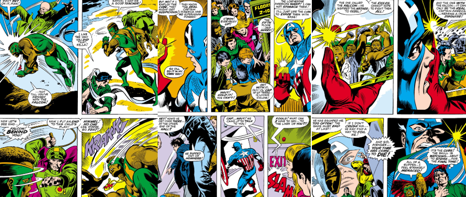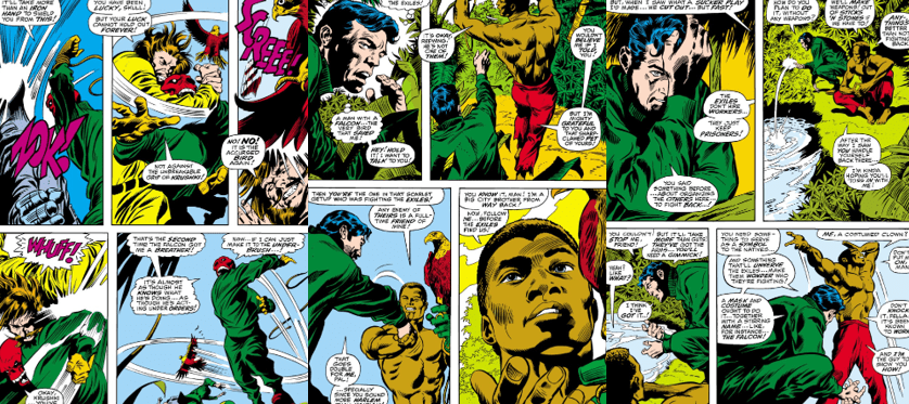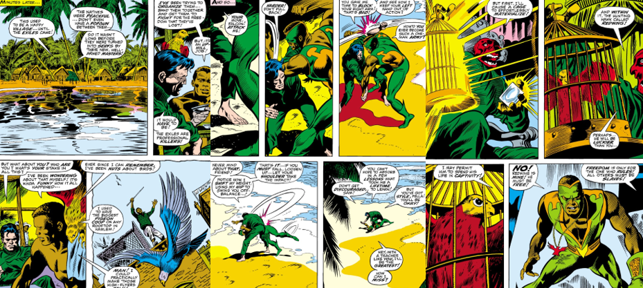 Unfortunately for Sam, Cap and the natives whisk up one of the worst costumes I’ve ever seen. God, it’s so awful, with its lime-green and brown-gold edging, it’s weird-ass cowl and strangely angled boots. Considering Cap encourages him to take inspiration from his love and use the moniker “The Falcon”, nothing about Sam’s outfit screams “Falcon” to me. He doesn’t have a bird-like cowl like, say, Katar Hall/Hawkman, doesn’t match Redwing’s gold and red/brown feathers, and doesn’t even have his now-iconic wings. Just about the only thing this outfit has going for it is its sense of native tribalism, but otherwise it’s truly a ghastly sight. Luckily, Sam’s personality makes up for it. He’s not some jive-talking street tough or a shallow Blaxploitation cliché; he’s just a regular guy from Harlem with a friendly disposition who wants to do what’s right. His time on the mean streets toughened him, sure, but there’s no sense of malice or ego. The only time he shows any anger is when Redwing is threatened and when confronted by the embodiment of xenophobic oppression. Otherwise, he’s a level-headed, affable young man who luckily turns out to be a natural when it comes to learning how to fight. In a short time, Cap teaches Sam how to defend himself, how to fight smartly, and leads him into battle against the Exiles, a fight that puts them at a disadvantage due to the group’s numbers and weapons but which the heroes ultimately triumph thanks to putting their skills to good use. This also sees the Falcon inspire the natives to rise up, though this was very rushed for me. There was never any indication that the people even know the Falcon was heading into battle that day. All they knew was that Sam was wearing a costume now, not that he’d done anything worth riling them up. Of course, Sam’s natural abilities are only half the story; Redwing gives him a memorable gimmick that helps him stand out against his peers. The bird is exceptionally well trained and intelligent, turning the tide in every battle the Falcon is involved in and proving invaluable to their cause.