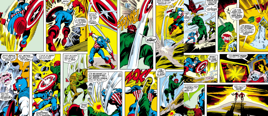 Beyond this, the story is a bit of a mess. I love the idea of the Red Skull attaining God-like power, and the Cosmic Cube effectively allows him to do anything. He can see anything he likes at will, switch bodies with people, teleport, conjure forcefields and the elements, and is functionally untouchable as long as the cube is in his hands. Unfortunately, the Red Skull is a cackling buffoon. Rather than simply will Captain America out of existence, he swaps bodies with him and dumps him on an island, where inept forces fail time and again to do his dirty work. Rather than reshaping reality in his image, brainwashing the masses and conquering the world a piece at a time, the Red Skull parades around in Cap’s body to take advantage of their goodwill, all while ruminating about how much he hates Americans and the many ways he’ll subjugate and destroy those around him. Rather than doing this, the Red Skull plots to destroy Cap’s reputation by…being rude to people! It’s ridiculous! He doesn’t even watch what’s happening on the island until it’s too late and gets so distracted bringing himself, Cap, and the Falcon to Berchtesgaden Castle that he doesn’t think to set aside his pride and just snuff their lives out with a thought. It’s typical, cliché supervillain behaviour to assume victory, bask in your superiority, and to toy with your enemies but I expected more from someone like the Red Skull! Despite demonstrating that he can protect himself from any attack with a thought, Shmidt is disarmed by a simple throw of Cap’s shield and then he completely fails to consider that A.I.M. might be angry at him swiping their most powerful weapon, leaving him undone not by his enemy, but by his own lack of foresight. Overall, this was a decent enough introduction for Sam Wilson; his costume was awful, but I liked his attitude and his gimmick. What lets it down, though, is the nonsensical main plot regarding Cap and the red Skull switching bodies. It’s a great concept but the story completely wastes it, having Shmidt lounge around thinking nasty thoughts but squandering his great power, leaving him undone in the lamest way possible.