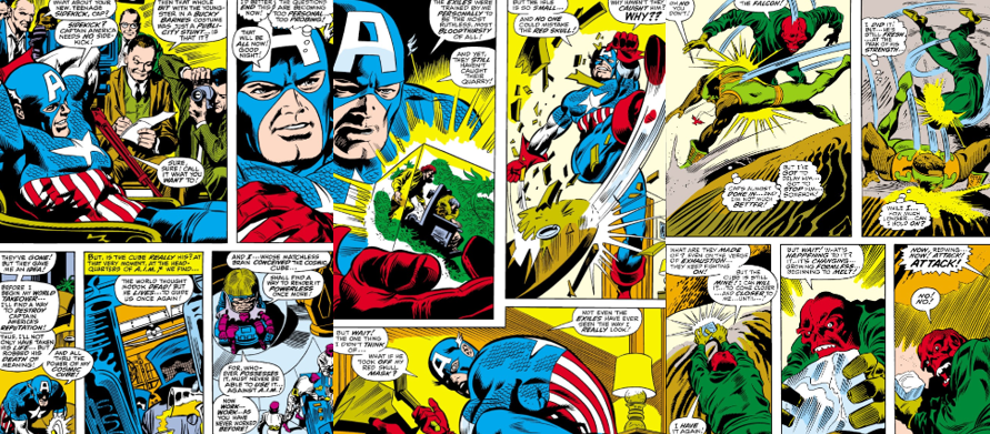 Consequently, the Red Skull doesn’t see the timely intervention of a falcon, later identified as “Redwing”, who distracts Iron-Hand long enough for Cap to fight him off with a swift uppercut. Redwing also helps Cap escape the iron grip of the brutish Ivan Krushki and, as Cap flees to the bushes, he notes that the bird seems to be trained, as if following orders. Cap surmises that the Exiles probably haven’t seen the Red Skull’s true face, so he removes the gruesome mask and manipulates his features with clay to move more freely around the island. In contrast, the Red Skull walks in the guise of Captain America, disgusted by the adulation and awe his appearance inspires and secretly conspiring to enslave everyone. The Red Skull revels in deceiving the masses, taking advantage of their goodwill, before deciding to further his victory against Captain America by destroying his enemy’s distinguished reputation. He is completely unaware that the Mental Organism Designed Only for Killing/MODOK and his beekeeper-suit flunkies at Advanced Idea Mechanics (A.I.M.) are working to render the Cosmic Cube they created powerless to avoid it being used against them. Back on the island, Redwing returns to his master, the jovial Sam Wilson, a lone vigilante against the Exiles. When Cap spots him, he thanks Sam for his assistance and learns that he’s a simple Harlem man who came to the long-peaceful island to organize a resistance against the Exiles. Sam relates that he had an affinity for birds since boyhood, communicating with them in a way beyond a simple animal trainer. When he unwittingly answered the Exiles’ call for a hunting falcon, Sam turned on them, unwilling to help them enslave others. While he initially laughs at Cap’s suggestion that he turn his love for falcons into a symbol, a costumed identity for the natives to rally behind, Cap soon organizes the creation of a garish outfit that will better suit his radical goals and dubs him “The Falcon”.