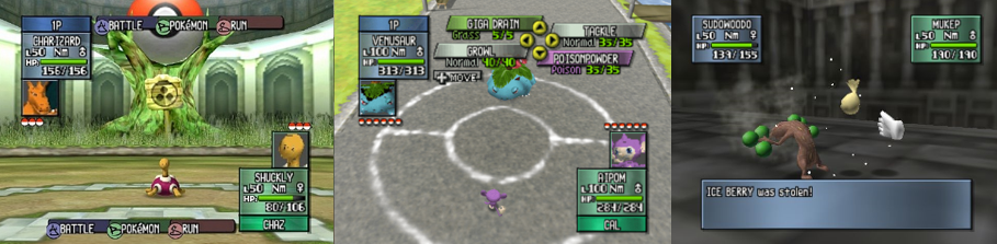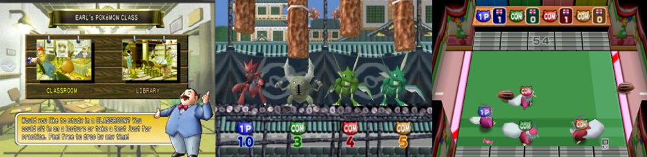 Again, most annoyingly, you cannot access the GB Tower, so you can’t play the first- and second-generation Pokémon games or utilise the speed-up features you unlock through battle. The Hall of Fame and picture mode also seems to be missing, though you can view all 251 Pokémon from the academy, essentially giving you a 3D PokéDex, and take part in quizzes to earn Medals (presumably for bragging rights). A whole new batch of mini games are also on offer here; each has three difficulty levels, with a fourth unlocked by playing on “Hard” mode. There’s another quiz here, too, and you can challenge the “Mini-Game Champion” mode where you play through each mini game, rolling dice beforehand to determine how many “Tokens” are needed to win and competing for the top score. Some mini games are similar to those from before; Pichu’s Power Plant, for example, has you tapping A or B in conjunction with a direction to charge electrodes like Thundering Dynamo and Tumbling Togepi sees you rolling across a treadmill avoiding obstacles, like Run, Rattata, Run. Otherwise, you’ll be tapping A to fly about as Golbats, bashing other players and collecting hearts, tackling rival Hitmontop out of a sumo ring, pressing A at just the right time to slice through falling logs, and dashing various PokéBalls into goals for points. There’s a four-way version of Pong (Atari, 1972) in which you ricochet balls using Mr. Mime’s Barrier, you’ll be running laps around a dirty track with Donphan, counting Pokémon as they march past, and gathering up presents to fill Delibird’s sack. You’ll also be catching falling eggs and avoiding Voltorb with Chansey and playing a version of musical chairs in Eager Eevee, tackling Aipom and avoiding an exploding Pineco when they appear in the middle of the arena. Since I didn’t play Pokémon Stadium 2 as a kid, I have less nostalgia for these mini games but they’re a decent enough distraction. Technically, though, they’re better and more challenging than the last game. As before, you’ll be awarded with special prize Pokémon for beating the game’s battle modes; you’ll even unlock a “Move Relearner” mode, though you obviously can’t take full advantage of any of this since you can’t plug in a Game Boy game.