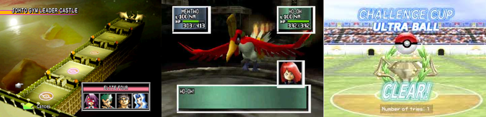 As ever, moves deal additional damage if you score a “critical hit”, but your Pokémon may also take recoil damage. You’ll need to be mindful of status effects such as being paralyzed or poisoned, though the game’s still rigged so no two Pokémon can be frozen or asleep per battle. As before, you’ll put together a team of six but only battle with three. You’ll see which Pokémon your opponent has but won’t know which ones they’ve picked, though I did find that Trainers and Gym Leaders tended to favour Pokémon of a certain Type this time (when challenging Falkner, for example, he and his underlings mostly used Flying-Type Pokémon). Still, you need to be mindful of enemy Pokémon surprising you with unforeseen moves and dragging battles out with moves like Protect, Disable, and Attract, which can cost you turns. The battle system has been tweaked here to incorporate items; when selecting you team, you can have them hold a single item that will passively take effect in battle. This will restore some health points (HP), or cure status effects like confusion, paralysis, or poisoning; however, you cannot manually use these items, and your opponent also holds the same items. Winning without receiving any damage earns you a continue should you be defeated (though abusing the save state feature greatly aids in this regard) and conquering the four “cups”, each with their own level restrictions and one of four PokéBall-themed trophies. The Gym Leader Castle returns, now pitting you against the Johto Gym Leaders and your Rival (who battles with Mewtwo, Ho-oh, and Lugia!) This time around, each Gym Leader has a different number of underlings you must battle beforehand, and Team Rocket even gatecrash the castle, forcing you to battle them. Besting all the Johto challengers unlocks the Kanto Gym Leader Castle, where you must face the Kanto Gym Leaders, Elite Four, and resident champion, Red, though you won’t have to battle past their understudies. Sadly, there is no big boss battle against a Legendary Pokémon this time around, though you’ll still unlock a much more challenging “Round 2” mode by winning all the cups and besting the Gym Leader Castle. There is a new cup on offer, Challenge Cup, where you’re forced to battle with a set team of Pokémon, and the “Event Battle!” mode is strictly for players with a game cartridge installed. Battles are as basic as before; since the items are limited, you can still get stuck if you’re hit with status ailments and it’s still way too easy to sweep your opponent’s team in a few hits.