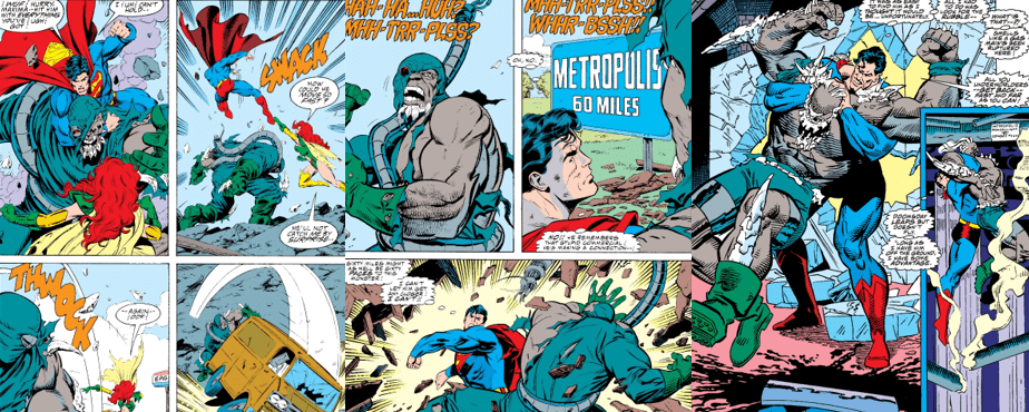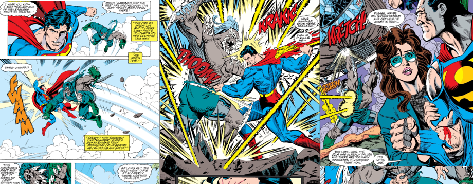 As a story about Superman’s will, “The Death of Superman” is quite powerful. Where the JLI and others fail due to being significantly underpowered, Superman fights on, battling Doomsday almost non-stop across the country. During their fight, Superman constantly stops to rescue bystanders and is always trying to keep Doomsday from populated areas. When he realises Doomsday’s heading to Metropolis, Superman desperately tries to keep him from reaching the city and, when this fails, he commits to ending the beast’s rampage. Sure, Superman rarely tries to get Doomsday off-world, but Doomsday is not only incredibly strong, but extremely agile and he easily escapes Superman’s grasp or leaves him gravely injured. At one point, Superman tosses Doomsday several miles away so it’s possible he could’ve launched Doomsday into space. However, Superman constantly notes that Doomsday never tires, seems to be growing stronger, and adapts to each situation. What works against Doomsday once won’t necessarily work a second time, something greatly expanded upon in subsequent appearances, so I think this is acceptable enough as an explanation for why Superman doesn’t just toss Doomsday into space. The conflict causes great distress for Lois and Jimmy, who are forced to watch and report as the man they love and admire is beaten to death before their eyes. While Lois eschews the usual restraint regarding her relationship with Superman to comfort and tend to him, the Kents are forced to watch, helpless, as their son is beaten to a pulp on live television. The impact of Superman’s deteriorating health is felt by every character and is palpable through the artwork. There’s a real sense of desperation as the fight reaches its climax and a shocking gut punch as the final blows are struck.
