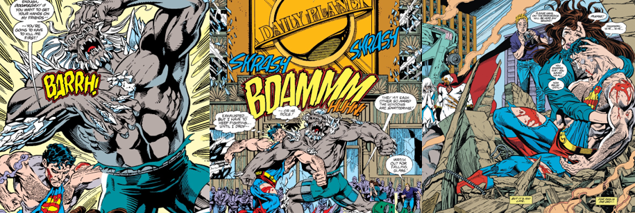 Superman’s second attempt to fly Doomsday away ends with him skewered through the abdomen by one of Doomsday’s spines. Finally released to assist, Supergirl is immediately dispatched with a single punch that reduces her to protoplasmic goop and even Professor Emil Hamilton’s massive laser cannon barely fazes the beast. Still, these distractions give the injured Superman time to regroup; hoping that Doomsday is as fatigued as him, Superman redoubles his attack. Luthor’s paratroopers and even Metropolis’s finest try to aid the Man of Steel, bombarding the creature with laser blasts that seemingly have no affect. Battered, exhausted, and desperate, Superman’s constantly distracted by saving innocents so, after rescuing Lois and Jimmy, he bids an emotional farewell to his fiancée and flies at his adversary, determined to put Doomsday down by any means necessary. Despite fighting for most of the day and having journeyed across the country and endured horrendous punishment, Doomsday easily overpowers Superman, cutting and bruising him. Superman finally hurts the creature by targeting Doomsday’s bony protrusions before the fight devolves into a slugfest outside the Daily Planet. Each blow shatters windows as the two relentlessly pummel each other, neither backing down until, finally, they fly in for the killing blow. Superman and Doomsday strike simultaneously, the force of their final blows sending shockwaves across the country, and Doomsday finally falls, apparently dead. Too late to help, Bloodwynd and Ice can only watch in shock alongside the world and Superman’s nearest and dearest as the Man of Steel collapses. Lois cradles her beloved, unconcerned about hiding her grief, as Superman breathes his last and succumbs to his wounds. Lois is left wailing as Superman, his costume torn and tattered and bloody, lies still amidst the rubble of his titanic clash, leaving the onlookers and his friends and family stunned.