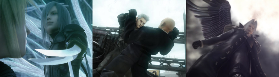 Birthed at the Northern Crater and appearing as manifestations of Sephiroth’s personality and spirit, the Remnants are like angry, defiant teenagers lashing out at a world they feel has mistreated them. Though similar and largely interchangeable, they are separated by some unique characteristics: Kadaj is the composed eloquent leader and wields a doubled-blade sword, Loz is the child-like brute whose punches and speed are augmented by a wrist gauntlet, and Yazoo…well, Yazoo largely disappears for me since he gets the least screentime and only stands out because he carries a gunblade and regularly mocks Loz for “crying”. While all three are passionate and emotionally unstable individuals, Loz is the most erratic of the three, desperate to be reunited with his mother and descending into anger or tears whenever he feels he’s let her down or been denied her. Seeing Cloud as their older “brother”, the Remnants mindlessly target him, Rufus, and anything remotely related to Shinra in a bid to retrieve Jenova’s head and complete their metamorphosis into Sephiroth. The Remnants summon Shadow Creepers to act as their minions and have no hesitation in using children as human shields to gain leverage. When they steal Cloud’s cache of Materia, Kadaj gleefully Summons Bahamut SIN to ravage the Meteorfall monument and attack the citizens to cause chaos and uncover Jenova’s remains. At times, Kadaj relates his despair at being a mere puppet, one with no true purpose other than to facilitate Sephiroth’s resurrection, yet he remains nonetheless determined to do this, mirroring Sephiroth’s anger at the world and his desire to destroy everything. Though he doesn’t fully appear until the climatic finale, Sephiroth looms over Advent Children Complete like a dark shadow. People are only sick because of him, much of Cloud’s guilt is because of Sephiroth, and the Remnants only exist to bring Sephiroth back. Once he does return, Sephiroth wastes no time in renewing his rivalry with Cloud, relishing the battle and taunting his foe, and using his vast powers to shroud the world in darkness, presumably in preparation for another meteor. Sprouting a single black wing and wielding the lengthy Masamune Blade, Sephiroth is effectively untouchable and attacks with a superhuman vigour, savouring his resurrection and the chance to torture Cloud both physically and mentally.