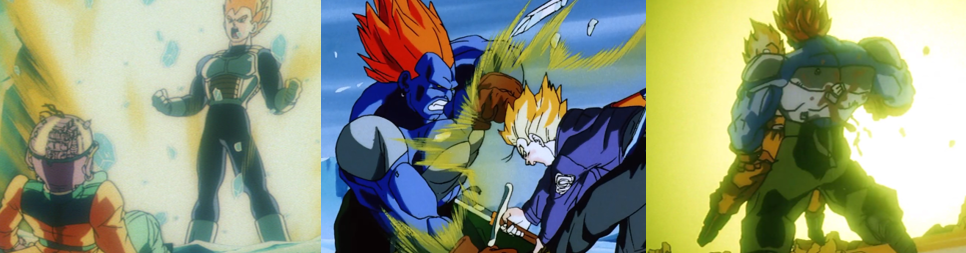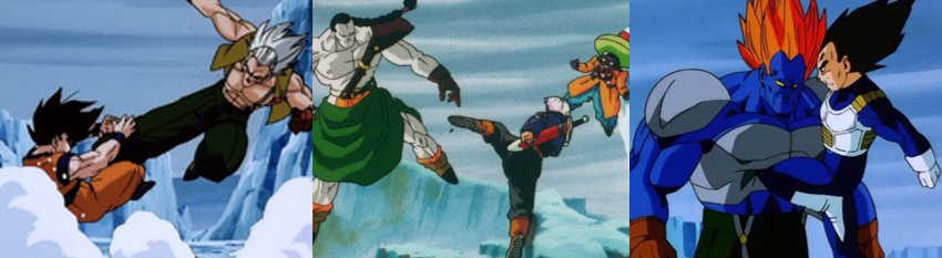 The three Androids exhibit some interesting quirks. Android #15 is small but deceptively strong and fast, displaying a sneering arrogance, and regularly swigging from a flask. Android #15 is a hulking brute who distracts the heroes with his powerful presence so Android #15 can catch them off-guard. Android #13 has an odd Southern accent; sporting a relaxed, unimpressive attire, he transforms into a grotesque demon that’s like a bastardisation of the Super Saiyan. As Super Android #13, he’s completely immune to all physical assault and he easily pounds the Saiyans into the ice, blasts them across the snow, and holds his own against even three Super Saiyans. Unlike in the show, none of the characters carry restorative Senzu Beans so they take a hell of a beating. Just defeating Super Android #13’s counterparts takes every ounce of energy the Saiyans have, leaving them exhausted and battered. It’s thus amusing to see Piccolo fly at Super Android #13 with such gusto.I admire his passion and bravery but it’s clear he has no chance against the brute, who can take a shot from Super Saiyan Vegeta without flinching. This determination is what’s primarily on offer in Super Android 13! Goku takes shot after shot and keeps getting up, Krillin is left a broken heap but still cheers on his friends, and Vegeta stubbornly refuses to back down even when he knows he has no chance of winning. Sadly, they reach this critical point far too quickly; once the Androids attack, the heroes are almost immediately left battered and fatigued, meaning the film rushes along at a brisk pace that defies realism.