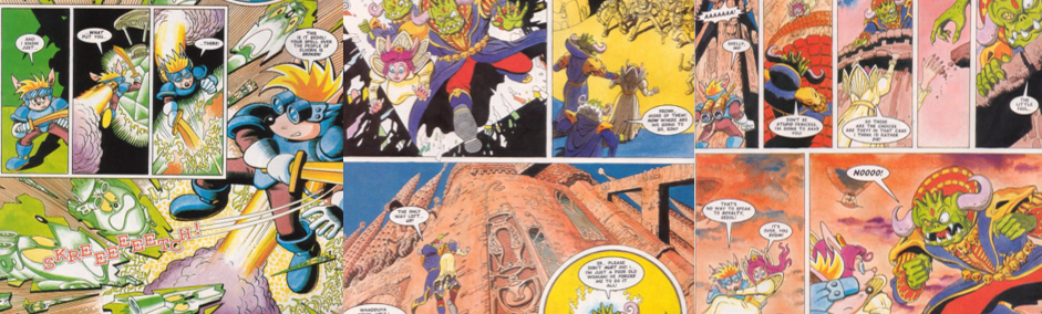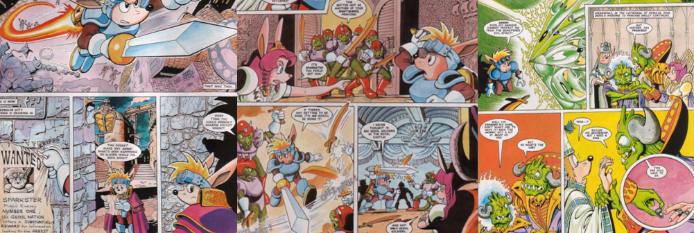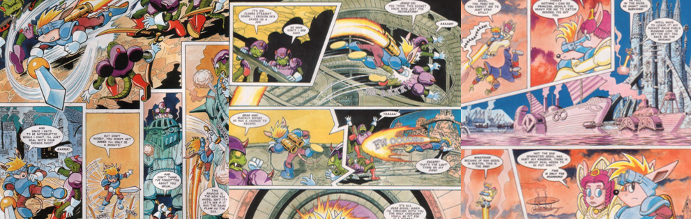 The incredible success of Sonic the Hedgehog (Sonic Team, 1991) saw anthropomorphic mascot platformers take the 1990s by storm, birthing everything from a sentient period, a gun-toting jackrabbit, a superpowered earthworm, and an intergalactic adventurer. Therefore, Nobuya Nakazato’s rocket pack-wearing possum fit right in at the time and delivered one of the best action platformers on the Mega Drive. Rocket Knight Adventures (Konami, 1993) was popular enough to get not one, but to sequels. While one was exclusive to the Super Nintendo, Sparkster: Rocket Knight Adventures 2 (ibid, 1994) was a well-received (if expensive and obscure) Mega Drive sequel that served as the inspiration for Sparkster’s one and only comic book appearance. This was a six-part story published in issue 53 to 58 of Sonic the Comic, a fortnightly publication I diligently collected as a kid which regularly included back-up stories adapting other SEGA-based franchises. Although writer Nigel Kitching was said to have worked on a follow-up story, it was scrapped when it turned out the publishers had lost the license, bringing Sparkster’s life outside the videogames to an end as he didn’t get an animated spin-off like some of this peers.