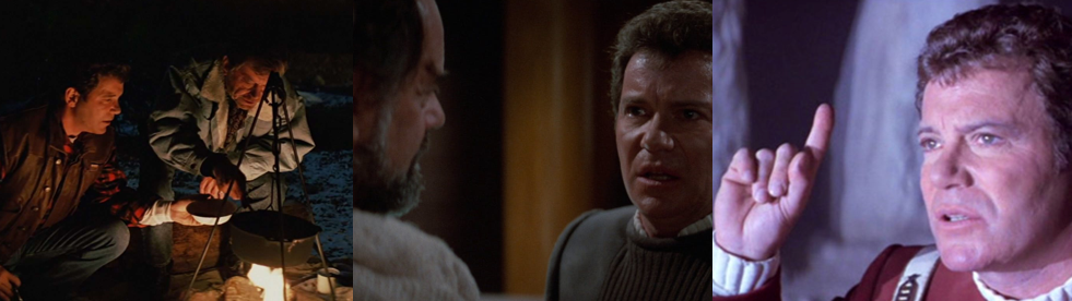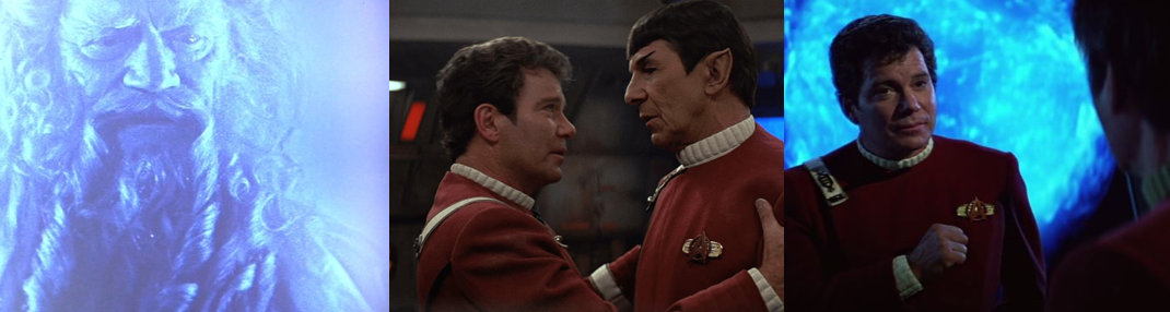 Though in a far better place, mentally, than in previous films, age is still taking its toll on Captain Kirk. Whereas “other men” have families to spend shore leave with, he spends his camping in Yosemite National Park with Spock and the miserly Doctor Leonard “Bones” McCoy (Kelley) since they don’t have anyone else. While Kirk fills his time with unnecessary risk-taking and Bones chastises Kirk’s foolhardy disrespect for life, Spock prefers to test his hoverboots and contemplate the lyrics of “Row, Row, Row Your Boat”. It’s while subtly mocking Spock’s misunderstanding of Earth customs that Kirk reveals a morbid belief that he’s destined to die alone, something which has left him somewhat emotionally empty and fearless. Despite his protestations about taking the malfunctioning Enterprise-A to address the hostage situation on Nimbus III, Kirk follows orders and finds new ways to get around the limitations of the script ship. He leads the away team in infiltrating the capital, only to find the hostages – the bitter St. John Talbot (David Warner), the disgraced General Korrd (Charles Cooper), and the alluring Caithlin Dar (Cynthia Gouw)) – have fallen under Sybok’s sway. Outmanned and outgunned, Kirk has no choice but to allow Sybok and the entranced diplomats safe passage to the Enterprise-A, where Sybok demonstrates his unique empathetic abilities. Even when faced with Sybok’s power, which causes visions of a person’s “hidden pain” to manifest visually, Kirk remains defiant. In one of the film’s best scenes (and of Shatner’s Star Trek career), Kirk launches into an impassioned tirade and vehemently rejects Sybok’s offer: “I don’t want my pain taken away! I need my pain!” Convinced that Sybok is a “con man”, at best, and “mad” at worst, Kirk both refuses to join him or co-operate and adamantly tries to talk him out of breaching the “Great Barrier” since Sybok claims to be on a mission from “God”. Kirk’s scepticism is briefly rocked when the Enterprise-A breaches the Great Barrier, but only for a moment. Just as he shrugged off Sybok’s allure, Kirk questions the authority and legitimacy of the “God” (George Murdock) they find on Sha Ka Ree. Again, Kirk feels untouchable, even when faced with a supposed deity, simply because he has not only seen more than enough to make him fearless and also because he’s “not alone” and therefore cannot die.