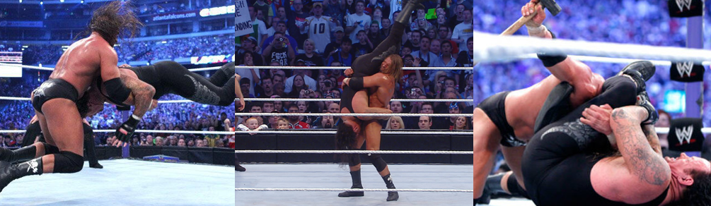 While the Undertaker is known for his overly long and dramatic WrestleMania entrances, Triple H is equally notorious for eating a lot of airtime with an elaborate entrance, though WrestleMania XXVII’s was a bit of an odd one. The Game was initially flanked by shield-bearers, draped in a regal cloak, garbed in his skull mask and helmet, and accompanied by Metallica’s “For Whom the Bell Tolls”. This was only an interlude, however, as Triple H switched to his ring gear after a brief blackout and stormed to the ring as normal, strangely ditching his “King of Kings” persona and any mind games the Metallica track might’ve played. Similarly, the Undertaker opted to simply rise from billowing smoke as simulated rain peppered the LED screens, though he was sporting a particularly fetching trenchcoat. The two went nose-to-nose prior to the bell and wasted no time getting into a slugfest once the bell rang, with Triple H briefly pummelling the Undertaker in the corner before being tossed over the top rope. Triple H continued to hammer the Undertaker on the outside until being sent into the ring steps, though the Game saved himself from being driven through the announce table by tackling the Deadman through Michael Cole’s special plexiglass cube. Having asserted his dominance, Triple H challenged the Undertaker to continue their fist fight, with the Undertaker knocking the Game down with a flying clothesline. After briefly softening Triple H’s arm, the Undertaker went for his signature rope walk only to be jerked off the top rope by his opponent. Triple H followed up by clotheslining the Undertaker back to the outside but got dumped to the floor when he tried to Pedigree the Phenom through the other announce table and then crushed when the Undertaker launched himself over the top rope and crashed into him from the ring!