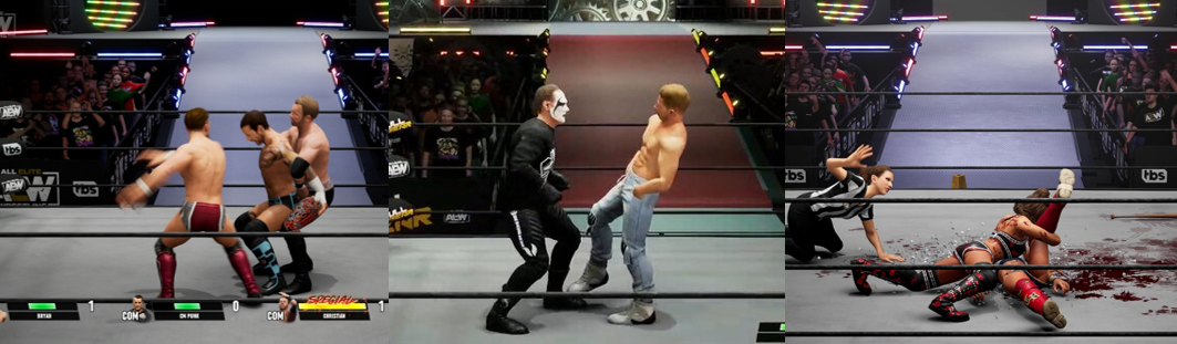 When not competing in a series of customisable wrestling bouts, players take either a created wrestler or a member of the AEW roster on a year-long journey through the company’s biggest names and matches.