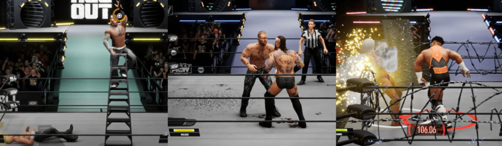 Naturally, every wrestler on the roster is your enemy, even your allies. While every wrestler controls and fights the same, with a set number of moves and abilities, your strategies may alter depending on who you fight. As each wrestler has multiple Skills, it’s worth becoming familiar with them as it does impact your play style. Custom wrestlers will set and refine these in the “Road to Elite” story mode, AEW stars have theirs set and cannot change them, and some even have unique Skills, such as “Freshly Squeezed” Orange Cassidy’s “Sloth Style” where he fights with his hands in his pockets. “Mr. Mayhem” Wardlow snatches guys out of mid-air, Powerhouse Hobbs briefly becomes immune to strikes, Maxwell Jacob Friedman/MJF bails out of the ring, and “The Bastard” Pac evades strikes and grapples with cartwheels and rolls. Similarly, you must adapt to superheavyweights like “No More B.S.” Paul Wight as undersized wrestlers will struggle to perform their usual moves due to the weight difference. Highfliers like Rey Fenix are smaller and more agile, often striking fast, quickly countering, and flying from the top rope. Jon Moxley lives up to his reputation as an insane brawler by focusing on strikes and excelling in hardcore environments, guys like “The American Dragon” Bryan Danielson are more technical, sporting a repertoire of submission holds and take downs, and career tag teams like Matt and Nick Jackson (The Young Bucks) have flashier double team moves to keep you off balance. In many cases, you can simply wait out or fight through your opponent’s unique skills, such as spamming combos on Wardlow until he starts feeling them and avoiding the top rope when facing opponents with the anti-air Skill.