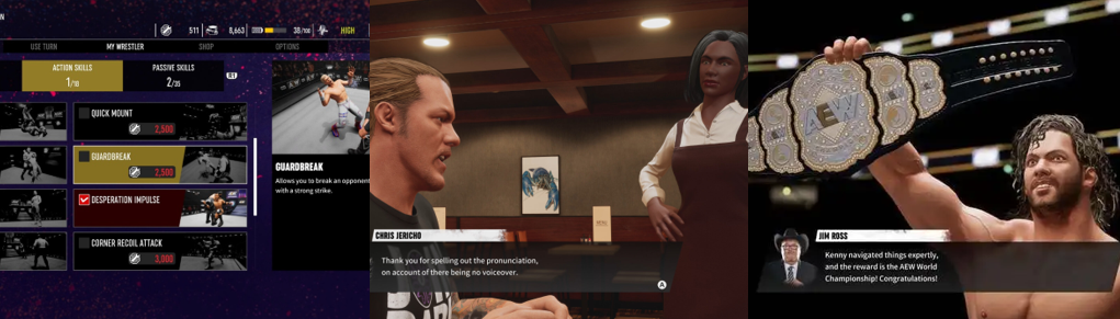 AEW: Fight Forever generally impresses with its visuals, particularly the wrestler models. Unlike the WWE videogames, AEW: Fight Forever opts for a slightly exaggerated, action figure-like aesthetic not unlike WWE All-Stars (Subdued Software/THQ San Diego, 2011). Each AEW star closely resembles their real-life counterpart, even down to their in-game grunts and taunts (with Sting howling and “The Machine” Brian Cage shouting at the crowd), though the game was noticeably outdated at launch and is even more behind the times now. The women, especially, come off really well, which is nice to see as they often look monstrous in the WWE titles, and each has their accurate entrance music, including “Le Champion” Chris Jericho coming out to “Judas” and CM Punk using “Cult of Personality”. Unfortunately, AEW: Fight Forever opts to use truncated entrances like WWF No Mercy. While you can press buttons to activate pyro and other effects, this may be disappointing to some (not me, though, as I always skip entrances anyway). However, I was disappointed by the lack of commentary, even for signatures and finishers, opting for a customisable soundtrack instead, which was a shame. In fact, voice acting is very sparse, with the odd sound bite or insight cropping up now and then but the game primarily relying on text and dialogue boxes. While it obviously helps make the random story paths more manageable, it does come off as a little cheap, similar to when you visit various landmarks in “Road to Elite” and are met with laughably low quality still images. I occasionally saw some texture warping during these cutscenes as well, and some graphical glitches (such as entrance weapons disappearing). Similarly, there aren’t many options for wrestler customisation and skins, with only a handful of AEW stars having true alternate looks. However, I would say AEW: Fight Forever looks and performs far better than a lot of recent WWE games, likely because it’s a far simpler and stripped back title.