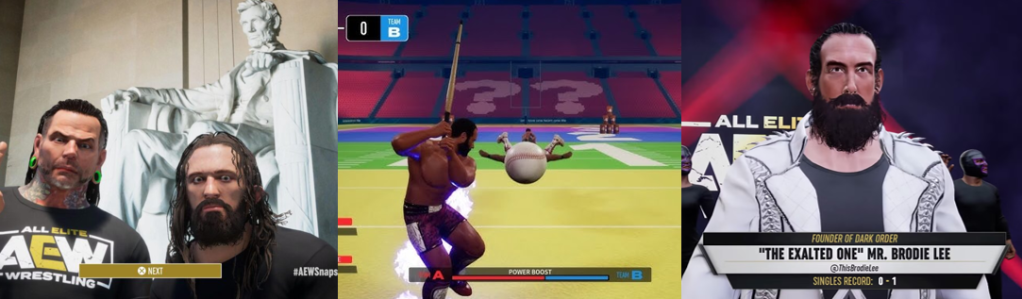 If the trimmed entrances and lack of commentary didn’t give this away, the barebones arenas sure do. On the one hand, I’m not all that fussed as the arenas are largely superfluous and their presentation does recall the likes of WWF No Mercy. On the other hand, this game came out in 2023, so I’d expect the crowd to look less basic. The audience is seeped in darkness and indistinguishable most of the time, though the fans are very loud and add a lot of ambiance to matches. There are only a handful of arenas here, though, so things can get visually repetitive very quickly. You can build your own custom arenas, but I find these always look stupid and this isn’t helped by the weird fixtures, decals, and colour schemes the game offers. Strangely, AEW: Fight Forever doesn’t allow for backstage brawling, with no backstage areas included, or brawling in the crowd, which is just bizarre. The Exploding Barbed Wire Death Match adds some visual variety, and the “Stadium Stampede” DLC shows what the game could be capable of, but the developers apparently thought it more important to waste resources on weird-ass mini games. These see you playing baseball, participating in quizzes, collecting tokens, shoving opponents from the ring and onto coloured balls, matching Penta El Zero M’s movements, smashing coloured boxes, and running across football fields avoiding hidden holes. These certainly add some visual variety, but they’re so out of place that it’s like the developer’s notes got mixed up. Similarly, you’ll see cutscenes of your wrestler working out, chatting, visiting the hospital, getting beaten up, or meeting fans when playing “Road to Elite”, all things that are certainly different and fitting for a wrestler’s lifestyle but seem out of place. Finally, live-action footage, clips, and voice overs interspersed through “Road to Elite” show key moments in AEW history, which was nice, though you oddly don’t recreate many of these moments as you play.