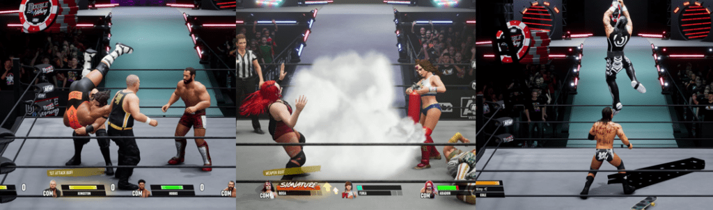 Some competitors (particularly custom wrestlers) may surprise you, however, as even smaller wrestlers can counter mid-air attacks or finishers. Generally, your opponents are only as difficult as you set the game and the match type dictates. For example, a 4-Way match pitting Darby Allin against Luchasarus, “The Redeemer” Miro, and John Silver will be an uphill battle for the colourful daredevil. Similarly, tag team matches can be a chore as the opponent’s partner constantly rushes the ring, just like in the old AKI games, and the Casino Battle Royale can end in an instant if you’re jumped from behind. Sometimes, your opponent’s attacks land faster and with more accuracy than yours but, other times, they simply stand there like a goober. The more you beat your opponent, the weaker they become, but the momentum bar charges ridiculously fast, and the match can change on a dime if your opponent gets a few good hits in or activates a buff. Generally, opponents rush you once the bell rings, so be ready to counter their attack…if you can get the timing of the blocking down. When playing “Road to Elite” on “Easy”, I found matches fluctuated. While I easily dominated most opponents, winning with a single finisher or even regular moves, others proved surprisingly aggressive, such as MJF with his dirty tactics and Pac, with his odd combination of speed and strength, yet I absolutely crushed Paul Wight, destroyed Chris Jericho, and easily toppled champions. This is true even in multi-man matches as you can get into a rhythm of wearing down a specific opponent (or keeping an eye on who’s taking a beating) and time your pins to happen as the other opponents are distracted for an easy win. “Road to Elite” got annoying for me simply because many paths push you into tag matches or gauntlets, and due to its random nature. You can access different paths and matches with different wrestlers, even competing in a Exploding Barbed Wire Death Match and battling a shadowy reflection of your wrestler in certain paths, and your opponents seem to be randomised each time to mix things up, though your general strategy of wearing them down to score a win remains the same.