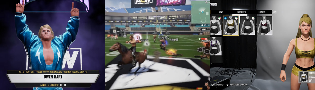 The create-a-wrestler mode is so lacking that it’s inferior to even WWF No Mercy, reminding me more of the laughable options seen in WWF WrestleMania X-8 (Yuke’s, 2002). You’re limited to picking set expressions and altering the basics of your wrestler’s appearance rather than changing every aspect, are given a paltry selection of clothes and accessories focused more on patriotic attire than AEW gear, and have so few options that it’s basically impossible to create current AEW stars. While there are a lot of names and moves to pick from and entrance options, it’s all disappointingly barebones, with even the shop offering little extra content. Team entrances are especially limited, it bugged me that I couldn’t even put a vest on my wrestler without picking a body suit, and it’s almost insulting how few options there are for masks and face paint. You can modify the AEW roster, but the options are again incredibly limited, meaning you can’t rejig “The Natural” Dustin Rhodes to look like Goldust. The create an arena is just as pointless, I couldn’t care less about the unlockable badges and such, and there’s little incentive on spending real-world money for the DLC wrestlers unless you simply must have Adam Copeland on your roster. They do add additional skins and moves, to be fair, and the “Stadium Stampede” mode (which is free to download but you need a subscription to play). This is a bizarre free-for-all arena battler where you compete against thirty other players on a football field, utilising horses, golf carts, and abilities, attacking enemies for poker chips to level-up your character. Lastly, you can use AEW Cash to purchase “The American Nightmare” Cody Rhodes and referee Aubrey Edwards, and unlock Paul Wight, “The Exalted One” Mr. Brodie Lee, and even the legendary Owen Hart by playing specific paths in “Road to Elite” for the former or winning 100 exhibition matches for the latter.