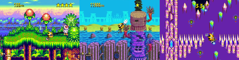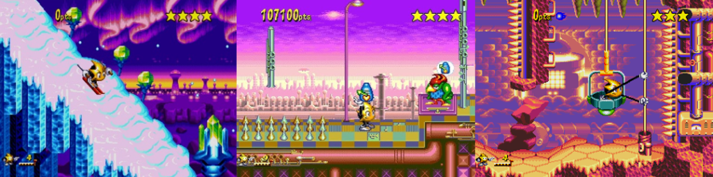Ristar is a very slow game. Ristar plods about very lazily and only gets his ass moving when flying at enemies or bouncing around off a Star Handle. The bulk of the game involves jumping across gaps, spike pits, lava, or other hazards, hopping to platforms and using Ristar’s grab to scramble about. Some jumps can be very tricky since Ristar’s reach will just miss, forcing you to take longer or more dangerous paths or to struggle with his wall climb. In Round 1, you grab floating fluff or passing birds to get higher, reach into tree holes for goodies, and smash trees to light up the woods, though spores stick to you and, like the starfish in Round 2, slow you and then explode if you don’t shake them off. Round 3 sees you tossing Ristar statues into glowing spots to avoid being hurt and trapped by cages, and outrunning rising flames to test your platforming and grabbing skills, and you’ll also hold B to raise a pulley and reach higher ground in the factory section. Round 4 has an odd carry mechanic where you grab metronomes and deliver them to singing birds to open new paths, utilising fans and pincers and conveyer belts and defeating enemies before the can steal your item. This Round features a musical theme, with you being bounced about by drums and timing your grabs just right to navigate narrow spiked chasms, as well as flying along on zip wires and hopping past dancing guitars. Round 5 introduces a slipping gimmick where you must time your jumps off icy platforms to keep from looping around, destroy rocks in the underwater cavern, and again deal with Round 2’s rushing water gimmick. Round 6 is, fittingly, the most dangerous, featuring spiked mincers, the slipping gimmick, poles and handholds that switch positions every time you grab them, and an overhead ray that zaps you to the background and forces you to defeat enemies and grab handholds while obscured. Things get quite challenging quite quickly; Ristar has a big hit box and spikes and other hazards are everywhere, meaning things can get frustrating in later Rounds.