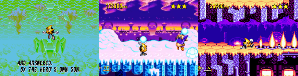 Visually, Ristar is one of the most impressive Mega Drive games. The colourful graphics, deep and detailed backgrounds, and vibrant presentation remind me of Knuckles’ Chaotix (SEGA, 1995), as do the wacky Round intro cards, story text, and sprites. Though one of gaming’s oddest characters, Ristar is full of life, sporting a determined frown, gleefully smashing enemies, yelping when hit, and blasting about when launched. Ristar sports a few idle poses that change in Round 4 and Round 5 to show him bopping along to the beat and struggling with the heat, respectively. The game’s story is very simple (and changes depending on your region) but is beautifully brought to life by both text and large, partially animated sprite art. Despite the title screen drawing immediate comparisons to Sonic the Hedgehog, Ristar is like a mish-mash of Sonic, Rocket Knight, Gunstar Heroes (Treasure, 1993), and Disney’s various 16-bit titles with both its gameplay and visuals, though oddly promoting precision platforming rather than fast-paced combat, perhaps to better showcase the stunning, cartoonish visuals and bizarre environments. While there’s no ending cutscene, stills showcase the ending and key moments during the credits and Ristar busts out a fitting victory pose upon defeating each boss and clearing the game. It’s a shame that his enemies aren’t as interesting, with players mostly smashing boring coloured Orblets, Unfortunately, Ristar can’t duck or look up, has no other combat options, forms, or power-ups, and his hit box is quite large. This is compounded by the odd decision the delay between grabbing health-restoring stars and Ristar’s health being restored, meaning you can grab a star and die before it’s added to your tally! As visually impressive as the game is, though, I was disappointed by the less than memorable soundtrack that cheaply recycles sound effects from Sonic 3 & Knuckles (SEGA Technical Institute, 1993/1994) during the final boss battle.