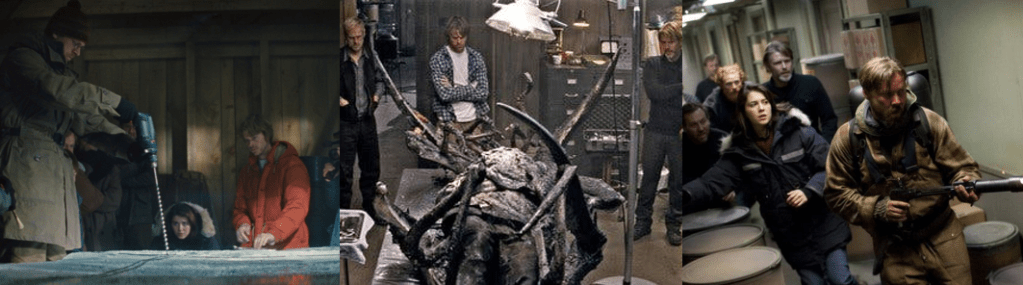 Nonsensical title aside (The Thing: Zero or The Thing: Origin might’ve worked better), The Thing is a rare example of a clever way to do a remake, even if the execution isn’t as memorable as John Carpenter’s film. The Thing is set in 1982, just like Carpenter’s movie, and follows the crew of Norwegian research station “Thule” in Antarctica, making it a direct prelude to John Carpenter’s movie. We saw glimpses of the Norwegian’s discovery and their gruesome fate in 1982 film, but The Thing expands upon what happened at Thule and even incorporates some elements from The Thing from Another World (Nyby, 1951). The film opens with the Norwegians randomly discovering a vast and ancient alien spacecraft buried deep under the ice, estimated to have been there for over 100,000 years. Though Thule houses a few scientific minds, Doctor Sander Halvorson (Ulrich Thomsen) and his assistant, Adam Finch (Eric Christian Olsen), assemble a team to investigate the crash and its ejected pilot. Adam suggests recruiting beautiful palaeontologist Kate Lloyd (Mary Elizabeth Winstead) and, despite the lack of details, she eagerly agrees and is as amazed as the others are by the discovery. Although they question why the pilot would’ve ejected, geologist Edvard Wolner (Trond Espen Seim) enthusiastically organises his men to help Kate excavate the creature, which they bring to Thule in a massive block of ice. Against Kate’s warnings, Dr. Halvorson orders a tissue sample to be taken from the entombed creature, chastising her for contradicting him and arrogantly wishing to be at the forefront of the find of the century. To be fair, Dr. Halvorson does promise to credit everyone with the discovery, which he verifies is the first recorded example of an extraterrestrial visitor to Earth. Despite her unease, Kate celebrates the reveal alongside the others, including pilots Sam Carter (Joel Edgerton) and Derek Jameson (Adewale Akinnuoye-Agbaje).
