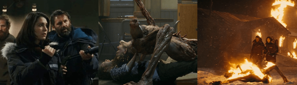 While inspecting the thawing ice block, Jameson is horrified when the titular “Thing” bursts free and, after a moment’s disbelief, convinces the others to search for it. When Henrik (Jo Adrian Haavind) and Olav (Jan Gunnar Røise) find the vaguely insectile creature under a building, Henrik is ensnared and seemingly devoured, splattering Olav with blood and leading the others to burn the Thing alive. The shell shocked team barely hold it together as Dr. Halvorson conducts an autopsy and finds a disturbing copy of Henrick within the mangled corpse. Against Dr. Halvorson’s wishes, Kate reviews the Thing’s tissue and is horrified to discover that the alien cells are attacking, absorbing, and replicating living tissue. Her warnings fall on deaf ears, however, as even Adam is in denial despite witnessing it for himself, meaning Kate’s powerless to stop Derek, Griggs (Paul Braunstein), and Sam from taking Olav to a medical facility (and, as Sam promises, getting military aid). However, after discovering bloody dental fillings in the bathroom, Kate rushes to flag down the helicopter, sure that someone onboard is the Thing. Turns out it was Griggs, who violently splits apart and crashes the chopper, though the others are still sceptical about Kate’s warnings, especially as the evidence has been cleaned up. Juliette (Kim Bubbs) offers to help Kate get the keys to Thule’s vehicles to keep Edvard and the others from leaving and potentially spreading the Thing’s reach, only for her to also be revealed as a Thing and kill Karl (Carsten Bjørnlund) before being immolated by the surly Lars (Jørgen Langhelle) and his flamethrower. Echoing a similar scene from the 1982 film, the survivors dig a ditch in the snow and burn all the bodies, agreeing to quarantine themselves until they can figure out who’s who using a blood test devised by Dr. Halvorson and Adam, just like in Carpenter’s film. Similarly, this test is sabotaged when the laboratory goes up in flames, which also raises tensions in the group.