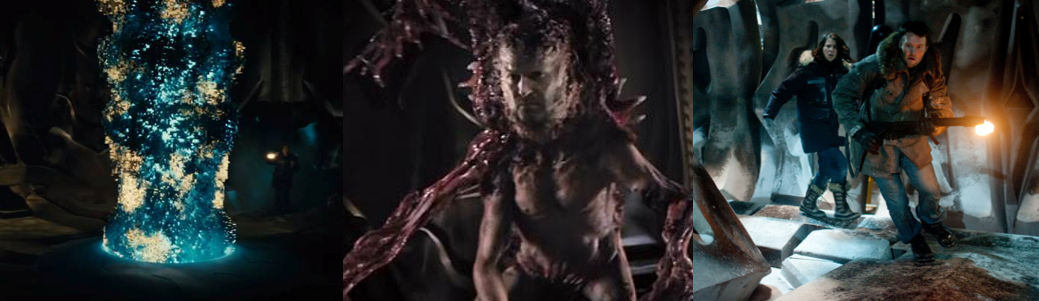 Kate and Sam follow the Halvorson-Thing back to the spaceship, which it activates in a bid to either return to the stars or infect larger civilised areas. The commotion separates Kate and Sam, leaving Kate to wander the highly advanced alien craft and stumble upon a glowing, geometric hologram that leaves her mesmerised for some time. This was initially a biomechanical alien pilot, not unlike the “Space Jockey”, that was originally planned to have been collecting alien samples before being attacked by the Thing. Other versions of the film had an animatronic version of this pilot (or a horrendous amalgamation of Dr. Halvorson, the pilot, and the Thing) attacking Kate for the finale. Instead, Kate stares at this weird lightshow before the disappointingly cartoonish, CGI Halvorson-Thing attacks, forcing her to find space to toss a grenade into its gaping, teeth-riddled maw. Luckily, Sam appears just in time to unload with a flamethrower, destroying the grotesque creature and shutting down the ship’s engines. Though exhausted and battered, Kate still has the wherewithal to notice that Sam is now missing his earring and burns him alive without hesitation, reducing him to a squealing mess of alien meat as the Thing is finally destroyed. While Kate heads towards a nearby Soviet base in the snowcat, pilot Matias (Ole Martin Aune Nilsen) returns to Thule from a refuelling mission and finds it in ruins, Colin having slit his wrists out of fear of being assimilated, and is confronted by a paranoid, trigger-happy Lars. After verifying that Matias is human, Largs desperately urges Matias into the chopper to pursue his fleeing snow dog, which was discovered brutally killed soon after the Thing first awoke, perfectly tying the end of this film into the beginning of John Carpenter’s The Thing…