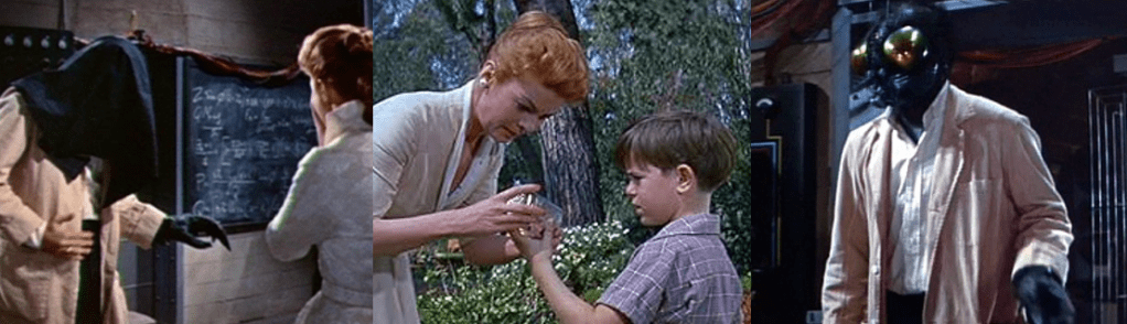Concerned, Hélène goes to check on him and finds him hiding his face behind a black cloth and keeping his left hand obscured. Though unable to speak, André converses through written and typed notes and by banging once for “yes” and twice for “no”, forcing Hélène to turn her back as he slurps his food and revealing that he experienced a horrible accident when he transported himself through the Disintegrator-Integrator. A common housefly got into the chamber with him and mixed up their DNA, leaving André with a deformed, fly-like hand and head and the fly with a human head and arm. Strangely, André retains his logic and reason but, knowing it’s only a matter of time before he loses his humanity, he orders Hélène to find the white-headed fly. Hélène spends a couple of days frantically searching all over for the fly, aided by her eager son and confusing their housemaid, Emma (Kathleen Freeman), who somehow misinterprets Hélène’s clear instructions to capture the fly and goes around swatting them. Determined to help her husband, Hélène repeatedly tries to corral the fly and is constantly met with failure: it slips out of Philippe’s net and eventually escapes into the garden, presumably acting as a fly would and slowly having its instincts overridden by André’s consciousness just as André becomes increasingly animalistic. Indeed, the frustration at his wife’s failure only exacerbates André’s condition. He struggles to type and write and keep his thoughts straight and warns that he will have to “destroy himself” if the fly isn’t found. Refusing to accept this, Hélène desperately begs André to try transporting himself again, confident that this will undo the damage, only to be left a shrieking, horrified wreck when she whips off André’s cloth and witnesses his gruesome fly head!