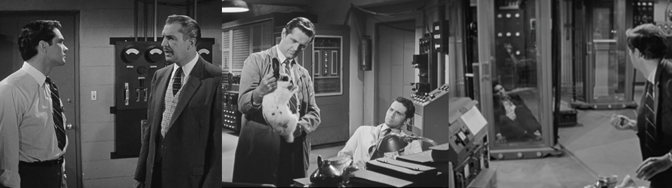 Undeterred, Philippe returns to his childhood home alongside his friend, Alan Hinds (David Frankham), who agrees to assist him and even waves off a salary to be part of the project and co-own it once they’ve changed the world. Both are quite taken by Philippe’s beautiful childhood friend, Cecile Bonnard (Danielle De Metz), who’s largely just here to be a pretty face, scream when she sees something awful, and babble in French about their childhood. Philippe and Alan quickly rebuild the Disintegrator-Integrator and successfully test it on inanimate objects. They also program it to “store” disintegrated objects to be reintegrated later (apparently a workaround for them only having one chamber), though they encounter a bizarre defect where the machine enlarges living organisms. It doesn’t take long for François to discover their progress and be coerced into aiding them, financially and with his knowledge, to keep Philippe from selling his half of the family company for additional funds (though François continues to oppose the project). Although disheartened that he effectively has to threaten his beloved uncle and encouraged by their progress, Philippe has no idea that Alan is secretly Ronald Holmes, an industrial spy looking to sell the secrets of the Disintegrator-Integrator to the unscrupulous Max Barthold (Dan Seymour) for an even greater profit. Having fled England for crimes so terrible he would be hanged if caught, Alan frantically overpowers Inspector Evans (Pat O’Hara) and sends him through the machine, only to produce a dead body with the hands and feet of a guinea pig and a guinea pig with human hands! After killing the animal and disposing of the body with Max’s help, Alan’s confronted by Philippe, who becomes concerned by his friend’s suspicious nature, only to be easily forced into the machine at gun point alongside a fly, which Alan spitefully tosses in with Philippe since he knows he’s deathly afraid of the insects.