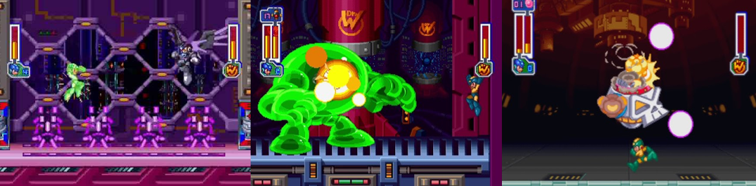 When in the Wily Tower, four additional mini bosses await, the first being a robotic penguin that requires the aggravating Mega Ball as you must perfectly position yourself to ricochet your shot up the shaft where Atetemino appears, avoiding the crates and missiles it drops. The Bliking aircraft is fought while on Rush Jet, so be sure to grab your other robo buddies to help. This thing fires screen-filling lasers and destructible mines and missiles, and can only be damaged (preferably with Astro Crush) when its wings are fully extended. Bass and Treble combine for a rematch, one far less taxing than Mega Man 7’s as he flies about, charges at you, fires his Mega Buster, and blasts a concentrated beam from above. The Yellow Devil is evoked by the Green Devil, who can only be damaged by blasting a hole to its mechanical core and firing your Flash Bomb or Thunder Claw. Thanks to it constantly deconstructing, summoning green waves and floor spikes, and filling the screen with its pieces, this is another exercise in tedium as you have such a small window of opportunity to strike. Success once again sees you battle Dr. Wily in a two-phase boss fight that’s far easier than the brick wall I ran into in Mega Man 7. Dr. Wily’s newest skull-like machine advances with a buzz-saw like appendage that it flings across the ground. This is easily jumped over, as are its charged laser beams and even its projectiles if you time your jumps right. You need to be quite close to hit it with the Flame Sword but the Water Balloon reportedly works quite well, too. True to form, Dr. Wily mans a UFO-like hovercraft for the final phase, one that teleports about the place and sends purple orbs out in a spiral or spread. While he’s often just out of reach, some of his shots home in, and he can rain Dark Energy into the arena, you should be able to finish him off with the Flame Sword (or, better yet, the Flash Bomb), especially if you still have Rush Health in reserve.