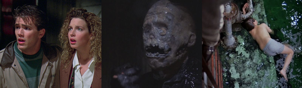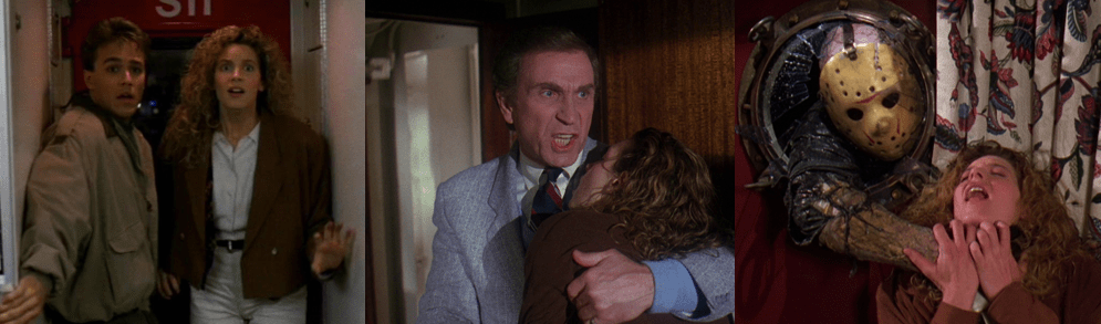 By this point, this is largely to be expected as Jason was the established star by this eighth movie. There’s no sense of dread or suspense to Jason as we clearly see him enter scenes or follow him as he stalks his prey with a hulking menace, sadly all while sporting an obvious visual downgrade from the last film. Depicted as strangely white and constantly wet and slimy, Jason sloshes his way though the ship seemingly at random, bashing J.J.’s head in with her guitar, thrusting a steaming hot sauna rock into Jason’s stomach, slitting Admiral Robertson’s throat (and leaving him propped up against the wheel for Sean to find), and stabbing Tamara with a mirror shard. Very few of these deaths are shown, of course, leaving us with a glimpse of the bloody aftermath. Much of Jason’s terror relies on jump scares as he now blatantly teleports from scene to scene to ambush his victims or get ahead of them, even when clearly seen to be some distance away seconds before. This ability is kind of fun and speaks to Jason’s unstoppable nature, but also inconsistent as he choses to pursue Rennie and Sean through New York rather than simply teleporting ahead. There are some interesting changes to Jason’s character, though, such as his legend evolving into a warning for inexperience swimmers and him apparently being both a physical force and a grotesque apparition that lurks under Crystal Lake and haunts Rennie. This child-like form constantly changes in every appearance, becoming more monstrous as the film goes on, and is always begging for help, tying into Jason as a tragic horror villain. However, this plot thread goes nowhere and means nothing. There’s no sense that Jason is trying to reunite with or destroy his boyish spirit, or that his child self is trying to help Rennie. Her psychic connection to Jason seems to lure him to her and even has him accidentally saving her from being raped, but that’s about it, making it a bizarre inclusion.