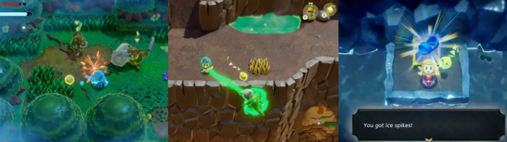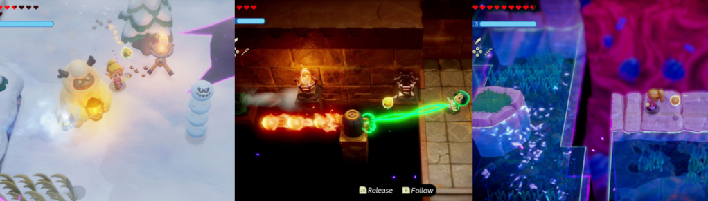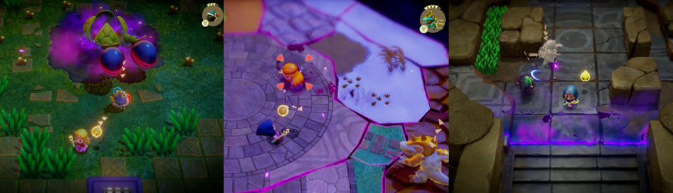 Much like the adorable and fun-packed diorama-like remake of Link’s Awakening, The Legend of Zelda: Echoes of Wisdom is a 2.5D, quasi-top down adventure in which players explore a version of the fantasy land Hyrule that closely mirrors The Legend of Zelda: A Link to the Past (Nintendo EAD, 1991) and its sequel. Of course, the most obvious thing that separates Echoes of Wisdom from other Zelda titles is that players now play as the titular princess for the first time in a mainline game…after clearing a quick pre-game sequence where you control a fully powered-up Link and battle the Demon King, Ganon. Once Link is sucked into a rift and lost in the “Still World”, however, you exclusively guide Zelda across Hyrule, sealing rifts and collecting “Sanctions” of the legendary Goddesses to confront the being responsible for the rifts, Null. If you’ve played the Link’s Awakening remake or the classic Zelda titles, Echoes of Wisdom will be immediately familiar, though it does include elements from The Legend of Zelda: Breath of the Wild (Nintendo EPD, 2017) and Tears of the Kingdom (ibid, 2023). Players talk to non-playable characters (NPCs), open chests and doors, or pick up various items with A, jump with B, and perform a spin attack with the Right trigger to cut through grass and move a bit faster (though it doesn’t damage enemies). Unlike Link, Zelda doesn’t carry a sword and shield, but she can still target enemies with ZL to send her “Echoes” in to attack. Zelda wields the Tri Rod, gifted to her by the pixie-like companion, Tri. By defeating enemies or encountering shimmering objects, Zelda can add Echoes to her repertoire with ZR and spawn them with Y. Each has a different cost, as indicated by Tri’s current level, and you must seal rifts and rescue Tri’s friends to level him up, which reduces the cost of using Echoes so you can spawn more to solve puzzles and attack enemies.