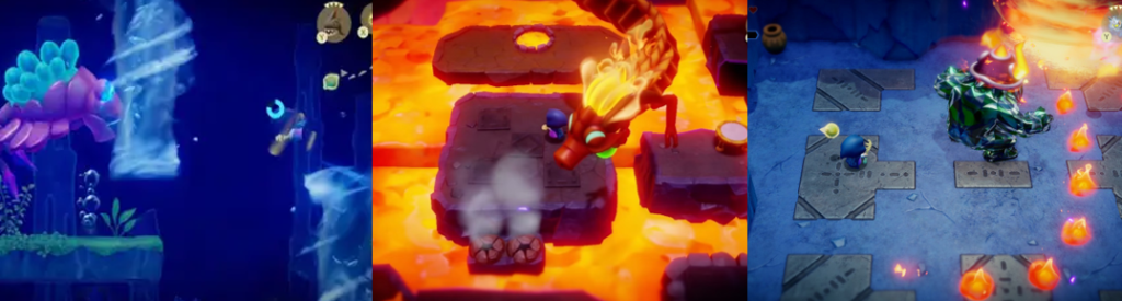 These are areas where Echoes of Wisdom shines best as it mirrors Breath of the Wild and Tears of the Kingdom by offering largely visually uninspiring dungeons. They’re not as confusing or layered as other 2 and 2.5D Zelda dungeons and are surprisingly easy to figure out considering the additional mechanics offering by Tri and the Echoes. It’s not too difficult to work out when you have to latch onto something and move it to higher ground, for example, or hit a faraway switch with something like a Boomerang Boarblin. Suthorn Ruins eases you into things nicely, appearing as an ancient, cave-like temple of cracked walkways and broken paths. Jabul Ruins emphasises swimming, with you avoiding whirlpools and grabbing air bubbles alongside stepping on coloured switches to raise a waterspout in the main chamber. Gerudo Sanctum features a wind gimmick and is structured like a boobytrapped training ground, forcing you to clear away and drain sand to progress, while Eldin Temple is housed within an active volcano. You must ride steam bursts, cross lava, and carefully climb rocky walls to progress. Faron Temple steps up the visuals as it’s housed within the Still World, so it’s got a surreal air to it, dark chambers, and crystals to charge with electrical attacks. Lanayru Temple and the surrounding mountains was probably my favourite area as you must fight against the slippery ice, stave off the frigid cold, and power up machinery to freeze or thaw different rooms. Things go full bonkers when you confront Null, however, as you battle through his insides alongside Link like the Kafai side quest in The Legend of Zelda: Majora’s Mask (Nintendo EAD, 2000) and traverse a fractured, bastardised version of Hyrule to reach the end. The game’s story is primarily told through speech bubbles, though some higher quality cutscenes crop up now and then. Musically, Echoes of Wisdom does well, emphasising more relaxed tunes than usual and peppering remixes of “Zelda’s Lullaby” and the main overture into the mix, though nothing really jumped out at me as very memorable.