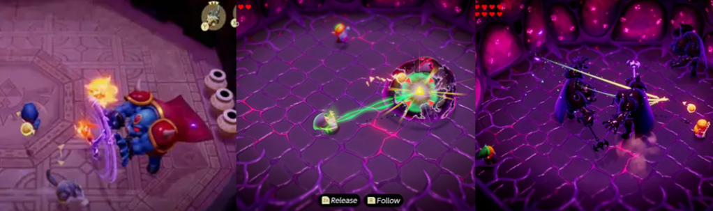 There are six mini bosses to contend with across Echoes of Wisdom, with your first being a battle against Ganon himself! This is essentially a stripped down version of A Link to the Past’s final battle as sees you (as Link) swatting Ganon with your sword as he teleports about, tosses his trident, and lunges from across the screen. You must defeat an Echo of Lord Jabu-Jabu to access the Jabul Ruins, and this fight sees you tossing Bombfish when he breaths in deeply and frantically swimming or hopping to wooden planks as he chomps around in the water. In Faron Temple, you encounter the multi-headed plant monster Manhandla twice, with you again stunning it by tricking it into eating Bombfishes so you can sever each head. In the second fight, it sprouts more heads, with two spitting projectiles. Lanayru Temple’s Slime Eye was a bit of a pain as you must avoid being squashed when it drops from above and spawn ice Echoes to freeze it. Each time you shatter it, it splits into smaller forms, which can quickly clog up the screen and make it difficult to avoid taking damage. When in the Stilled Ancient Ruins, Zelda battles her rift-spawned doppelgänger, who floats about and spawns shadow monsters of her own. You must lock onto her and fire your arrows to knock her down, preferably spawning a Lynel to handle her minions and deal big damage to her as she has a lot of help. Additionally, your most persistent enemy in Echoes of Wisdom is a shadowy double of Link who’s fought three times. Each time, he adds a new weapon to his arsenal which you receive upon victory, meaning you must battle against his sword swings, bomb tosses, and arrows. Link fires up to three arrows, charges a Spin Attack, jumps about, and powers up to be faster or spawn duplicates. Still, it’s generally easy enough to distract him with one Echo and spawn another to hit him from behind even with pits or multiple attacks to worry about.