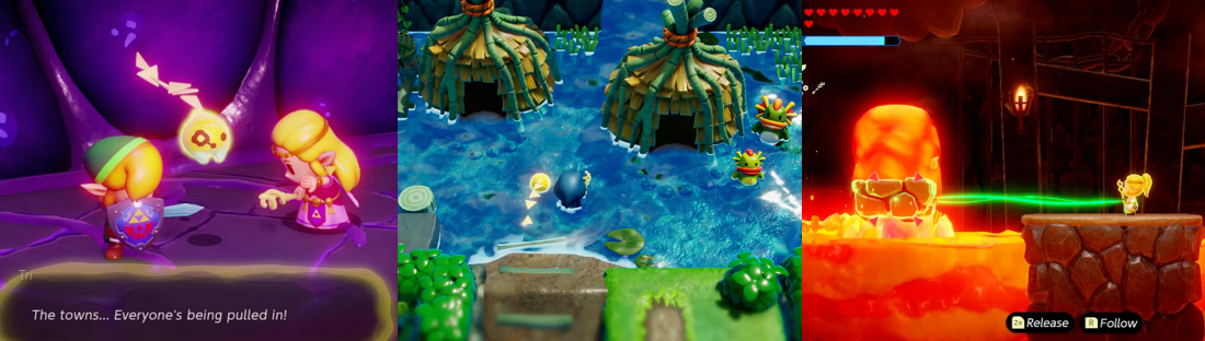 Much like the adorable and fun-packed diorama-like remake of Link’s Awakening, The Legend of Zelda: Echoes of Wisdom is a 2.5D, quasi-top down adventure in which players explore a version of the fantasy land Hyrule that closely mirrors The Legend of Zelda: A Link to the Past (Nintendo EAD, 1991) and its sequel. Of course, the most obvious thing that separates Echoes of Wisdom from other Zelda titles is that players now play as the titular princess for the first time in a mainline game…after clearing a quick pre-game sequence where you control a fully powered-up Link and battle the Demon King, Ganon. Once Link is sucked into a rift and lost in the “Still World”, however, you exclusively guide Zelda across Hyrule, sealing rifts and collecting “Sanctions” of the legendary Goddesses to confront the being responsible for the rifts, Null. If you’ve played the Link’s Awakening remake or the classic Zelda titles, Echoes of Wisdom will be immediately familiar, though it does include elements from The Legend of Zelda: Breath of the Wild (Nintendo EPD, 2017) and Tears of the Kingdom (ibid, 2023). Players talk to non-playable characters (NPCs), open chests and doors, or pick up various items with A, jump with B, and perform a spin attack with the Right trigger to cut through grass and move a bit faster (though it doesn’t damage enemies). Unlike Link, Zelda doesn’t carry a sword and shield, but she can still target enemies with ZL to send her “Echoes” in to attack. Zelda wields the Tri Rod, gifted to her by the pixie-like companion, Tri. By defeating enemies or encountering shimmering objects, Zelda can add Echoes to her repertoire with ZR and spawn them with Y. Each has a different cost, as indicated by Tri’s current level, and you must seal rifts and rescue Tri’s friends to level him up, which reduces the cost of using Echoes so you can spawn more to solve puzzles and attack enemies.