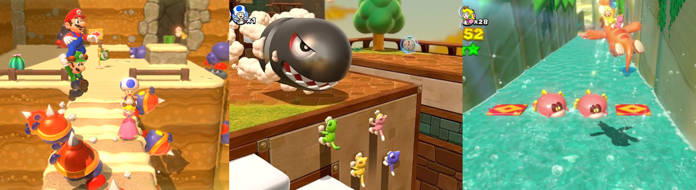 Super Mario 3D World is a 3D/2.5D hybrid action platformer that mixes gameplay elements from the New Super Mario Bros. series (Nintendo EAD, 2006 to 2019) with his 3D adventures, allowing for a limited degree of movement on the whimsical Sprixie Kingdom overworld and in certain stages (referred to as “Courses”) while also offering traditional, sidescrolling platforming. The game supports up to four players in simultaneous co-op, with players initially picking between the classic Super Mario Bros. 2 (Nintendo R&D4, 1988) line up of Mario, Luigi, Peach, and Toad (though a blue-coloured version). While each character shares the same controls and many basic abilities, they all play a little differently: Mario is the all-rounder, Luigi is faster can extend his jump by kicking his legs but is very slippery, Peach is slower but can float for short periods, and Toad is the fastest but has a stunted jump. As ever, players collect yellow Coins (with 100 granting an extra life, also gifted by 1-Up Mushrooms or defeating multiple enemies in a row), play against a timer (extended by collecting +Clocks), and must reach a flagpole to finish each Course. Players can hop to platforms and bop on heads using A or B, holding it to jump higher and tapping it to swim, and run by holding X or Y. ZL or ZR see you crouch to fit through narrow gaps and you press B to jump, or press a trigger in mid-air for a ground pound (performing a boosted jump if you hit B as you land). Rotate the left stick and hit B to perform a spinning jump, hold a trigger and press Y to roll or press B for a long jump, and press Y in mid-air for a jumping roll. Characters perform a wall jump by jumping against walls, perform a side flip with a flick of the left stick and a press of A/B, and spawn a reserve power-up by pressing up on the directional pad (D-pad), with left allowing you to scan an Amiibo and down activating snapshot mode. You can also hold Y to grab and throw items (like Koopa shells and snowballs), with the projectile collecting Green Stars and Stamps, and you can bash blocks for Coins and power-ups or hit POW Blocks to wipe out all onscreen enemies.