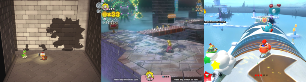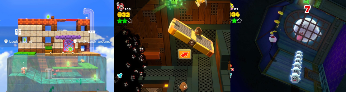 There are a whopping 380 Green Stars to find in Super Mario 3D World, many hidden out in the open, spawning after collecting eight Green Coins, or hidden behind platforming or combat challenges or in obscure areas. You can earn additional Green Stars in the Captain Toad and Mystery Box challenges, which test your puzzle solving, platforming, and combat prowess, and earn others for battling mini bosses like Boom Boom when they appear on the overworld. Green Stars unlock additional Courses and adds a special stamp to your save file, with another awarded after beating the game. There are also 85 Stamps to find across each World and in Sprixie houses, with players earning a piece of character art for each one, and players can track their progress regarding these collectibles by pressing the – button on the overworld. Courses and Worlds also contain hidden exits and optional routes, hidden areas where you can stock up on Coins and extra lives, and even Luigi cameos to celebrate Mario’s brother. Clearing the main game unlocks Luigi Bros., a modified version of the original arcade Mario Bros. (Nintendo R&D1, 1983), and opens World Star, World Mushroom, World Flower, and World Crown. These Worlds feature much tougher, remixed Courses with tighter time limits, tougher enemies and challenges, and rematches against previous bosses. Clearing the “Super Galaxy” Course unlocks Rosalina, a slow character with a spinning attack, as a playable character, and you’ll also be encouraged to replay previous Courses to set new times and high scores. There are 100 Cat Shines to collect in Bowser’s Fury, with additional ones appearing after you clear the game alongside a useful quick travel feature. Grabbing all the Cat Shines alters the final battle with Giant Bowser and also awards an alternative ending and grants Mario and Bowser Jr. some new cat duds.