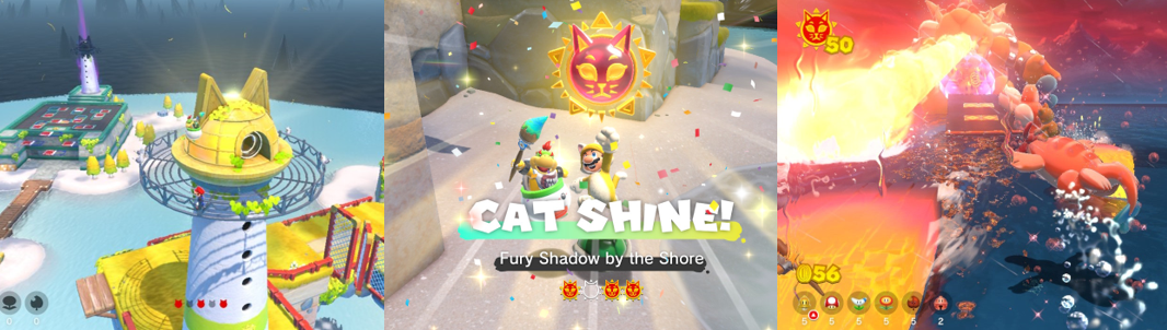 In Bowser’s Fury, you only play as Mario (with all the same abilities and power-ups as in the main game), though a second player can jump in as Bowser Jr. If you don’t have a friend, Bowser Jr. will still automatically help out, attacking enemies and grabbing items and interacting with the environment when you touch the screen, and you can customise how much he aids you from the settings. This game is akin to Super Mario Odyssey (Nintendo EPD, 2017), with Mario tracking down Cat Shines like Power Moons. Each area has four islands or sub-areas that hide five Cat Shines and a bunch of additional ones. The easiest Cat Shines are at the foot of lighthouses, which will clear the goop covering them to offer tips and additional power-ups (with multiples of each held in reserve), though you’ll also be collecting Blue Coins and five Shine Shards to earn additional Cat Shines. Others are earned by fending off enemies in an enclosed arena, racing across the water on Plessie, running to a specific point against a time limit, finding a key to unlock a cage, chasing a suspiciously familiar “Fury Shadow”, and defeating mini bosses. You’ll be clambering up walls, desperately running around rotating blocks and cylinders, avoiding lava pits, dealing with switch switches, and hopping to moving and temporary platforms and blocks, tapping the screen to reveal invisible areas and blasting across gaps with cannon-like pipes. Wearing the cat suit lets you spin special wheels or fling yourself about using special coils, and you’ll again need bombs and ice skates to progress. The purpose of the Cat Shines is to clear up the goop, uncover the “Giga Bell”, and access new areas, but you’re constantly under threat from the Kaiju-like “Fury Bowser”. After a short time, Fury Bowser rises from the oil and bombards the island with falling spikes and unleashes his devastating fire breath, though these can be used as temporary platforms and will shatter “Fury Blocks” to uncover additional Cat Shines. Fury Bowser’s rampage ends after a short time but can be dispelled by collecting Cat Shines and using the lighthouses. You can also engage him directly by activating the Giga Bell, though the mechanic does quickly grow tiresome despite how epic and ominous hiss appearance is.