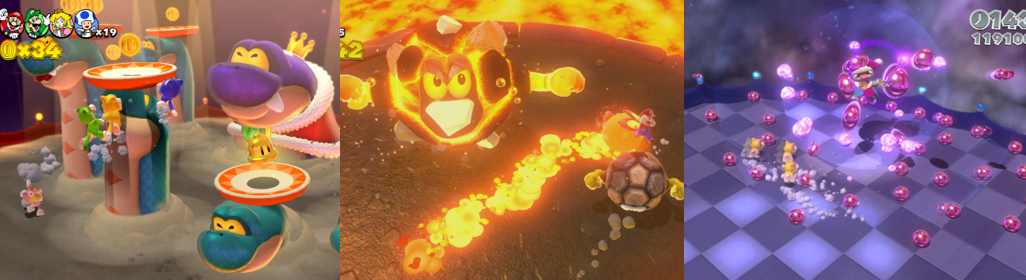 The brutish Boom Boom and the more effeminate Pom Pom regularly appear as boss battles in enclosed arenas, with Boom Boom whirling his stumpy arms like a dervish, temporarily turning invisible, and ricocheting off the walls as a spinning shell. Pom Pom prefers to throw shurikens and spawn duplicates to disorientate you, though bouncing on each of their heads three times will do them in. Cat variants of both also appear in Bowser’s Fury, though the strategy remains the same. This is true of the Cat Prince Bully, a variation on the armoured Prince Bully from World 6. When first encountered, you must force the Prince Bully into one of the pipes lodged into the arena walls to compress him and attack and, in both encounters, players must watch for his charged fireball. The regal Hisstocrat also pops up twice, first in World 2 and then in World Bowser, with subtle differences between them (their gender, for one thing, and raining either boulders or fireballs). In both encounters, players must avoid the falling hazards and scamper up snakes to attack Hisstocrat’s weak spot, being careful not to linger as the snake columns will bite and Hisstocrat will destroy them. Players will also battle Boss Brolder in a sweltering volcano, avoiding his lava trails and hitting the Brolders he spawns to toss them at him. This can be a gruelling fight in World Castle as flaming Splorches also patrol the small platform and King Brolder’s attacks are far more aggressive. The jester-like Motley Bossblob is also fought several times, with this trickster transforming into a bulbous form that bounces around, producing shockwaves, and splitting into gelatinous orbs that scatter across the circus-like arena. Finally, there’s King Ka-thunk, a giant Ka-thunk who flips about the arena and tries to skewer you with his spikes. To beat him, simply stand in the middle to avoid being hit and jump or butt stomp onto his backside, though be wary as his movements speed up. All these bosses return in “Boss Blitz”, the final Course in World Flower, where you must run the gauntlet against them all with no power-ups and no checkpoints.