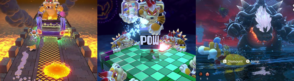In addition to hopping along his trains and tackling his tank brigade, players will naturally battle Bowser on numerous occasions. The first time is at the end of World 1, where he awaits atop his keep and drives his bitchin’ muscle car. Bowser accelerates away from you, forcing you to chase, dodging pools of lava left behind by his fireballs. Bowser tosses bombs that you must kick back to deal damage to his car and eventually send him packing. This fight is revisited in World Castle, though made much more gruelling as the “road” is littered with hazards such as spikes, gaps, and flame bursts, alongside Bowser’s usual and much more lingering fireball attacks. Bowser’s bombs can also have a short fuse this time, or are thrown at odd angles, or you’ll have a hard time hitting them due to the obstacles, though projectile-based power-ups help chip away at his car. In the finale of World Bowser, Bowser grabs a Super Bell and transforms into “Meowser”, a gigantic, cat-like form that scampers up and down a tower, bursts from walls to swipe at you with his huge claws or his Tanooki-like tail, and breathes fire. You can scare him off by hitting POW Blocks but cannot attack him directly, and Meowser even duplicates himself with a Double Cherry to make the frantic climb even more tense. This is actually a fun platforming challenge, however, and an incredibly simple boss. Once you reach the roof, you must hit a Super POW Block four times before the duplicated Meowsers finish you off, sending him into the gloop-infested islands of Bowser’s Fury. Here, Fury Bowser awakens and causes havoc, prompting you to activate the Giga Bell and transform into Giga Cat Mario to fend him off. In this titanic fight, you can melee attack Bowser but mainly attack by butt stomping his exposed belly after dodging his shell slam. Bowser charges at you, leaving a trail of goop that slows you down, spits fire, rains spikes across the environment, produces shockwaves, and spawns bombs and pillars you can use against him. After the fifth encounter, players battle Giant Bowser, riding around on Plessie to dodge his projectiles and ramming a crystal to damage his vulnerable belly.