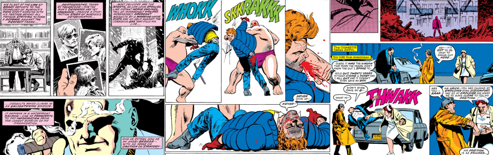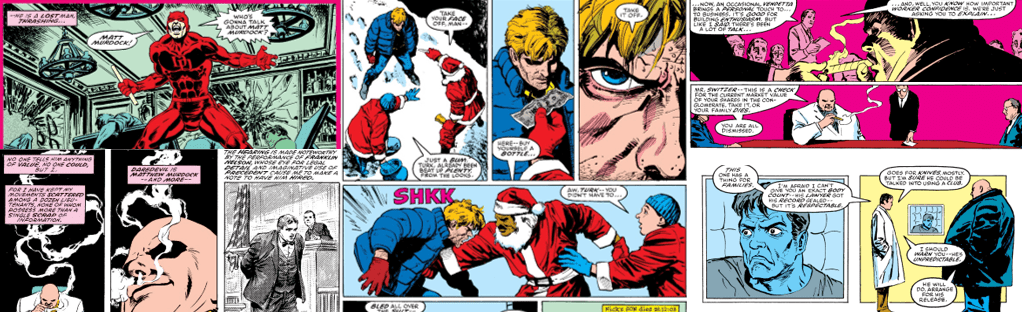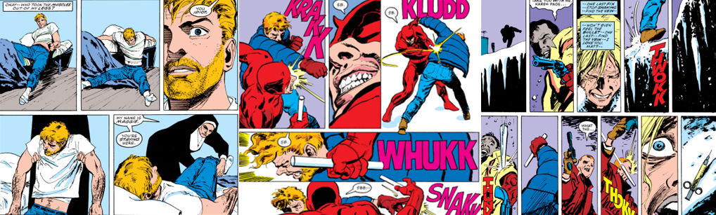 This seminal storyline was kicked off by Karen Page, former secretary for Murdock and Franklin “Foggy” Nelson’s law firm and Murdock’s ex-girlfriend, who left to pursue an acting career and ended up a heroin addict. She becomes so desperate for cash and a shot of heroin that she trades the only thing of value she has left, Daredevil’s true identity, to the unscrupulous Raldo. He sells it higher up the chain to Tonio, who eventually brings it to Wilson Fisk/The Kingpin, who immediately orders the death of everyone who’s touched the document and heads to New York City to verify its contents. Unaware of this, Murdock awakes from a troubled sleep, nursing the bruises of his recent battles, to find only bills and a breakup cassette from his girlfriend, Glorianna “Glori” O’Breen, rather than job offers. To make matters worse, Murdock gets a disturbing phone call from his accountant and is then accused of perjury by decorated cop Lieutenant Nick Manolis. As snow blankets the city, Foggy comforts Glori after a break-in and reporter Ben Urich tries to offer Matt some council, only to get a cynical brushoff. Murdock uses Daredevil as an escape from all this drama, sprinting and leaping into the bitter winter night and gives Manolis a scare, learning that the cop lied to protect his son and then returns home to find his utilities have been cut off. The Kingpin watches with relish as Murdock’s life falls apart over the next few weeks. He exhausts himself trying to build a defense with Foggy, physically deteriorating from the stress and becoming increasingly violent as Daredevil, and becoming a shell of his former self as he loses his licence to practice law and is faced with poverty and public shame.