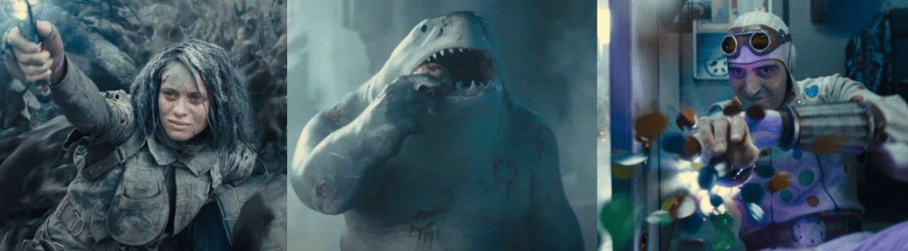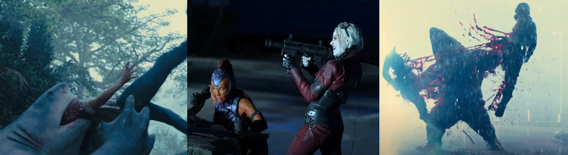 Where The Suicide Squad really stands out from, and trumps, the last film is in its use of gore, copious swearing, violence, and explosive action. The first film felt like it was holding back by having the team battling glorified zombies but this one pulls absolutely no punches; the opening scene alone sets the tone by showing Flag lead a doomed beach-front assault that sees members of his team getting immolate, shot to pieces, and blown into bloody chunks. King Shark is responsible for many moments of bloody violent thanks to his ravenous hunger and the competition between Bloodsport and Peacemaker lead the two to murdering numerous members of the Corto Maltese rebellion. Hell, Harley gets an entire side plot where she fights, shoots, and kills her way out of Luna’s mansion and the film’s hard-hitting action scenes are punctuated by endlessly entertaining explosions, gore, and over the top violence that finally does what the first film so desperately tried to do (i.e. take what we saw in the first two Deadpool films (Miller, 2016; Leitch, 2018) and ramp it up a few notches).