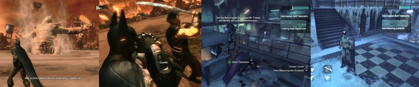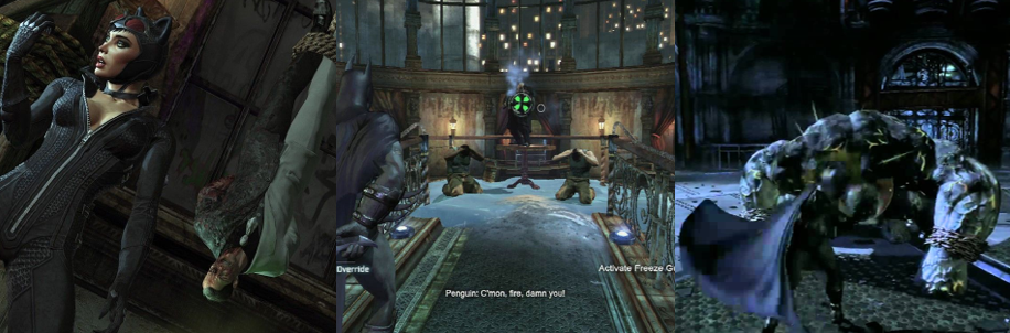 In a change of pace for this series, you go one-on-one with the Joker in Arkham Origins Blackgate, to a degree. You fight him in a small, enclosed space where his minions toss grenades and the Joker races around a central obstacle, smacking you with an electrical baton whenever you get close. Accordingly, you must run in the opposite direction and time your Line Launcher to fly in and land a combo, but he’ll also take shots with his pistol, floods the arena with poisonous gas, and has the largest health bar of any boss so far. However, he’s a walk in the park compared to the final boss, initially teased as another tedious fight against Bane but which turns out to be an infuriating three-stage fight against Catwoman, of all people. Before you fight her, you’re forced to search all over finding and defusing bombs before you battle her in the same format as in the first encounter, except she’s added Bronze Tiger’s leap to her arsenal and trying to counter her claw swipes is even more difficult. After this, she blinds Batman and strikes from the darkness; your only cue to when she’ll attack is the brief glow of her goggles and a little jingle, meaning it’s way too easy to miss-time your counter and get hit. Survive this phase and she appears to duplicate, with her doubles feigning attacks and the true Catwoman striking so quickly and so awkwardly that it’s near impossible to correctly time your counters as you need to press Y slightly before the indicator appears. Oh, and you need to repeat this last phase three times, with the fakes and attacks increasing each time, making for the most irritating boss battle in the franchise since that God-awful fight with Slade Wilson/Deathstroke!