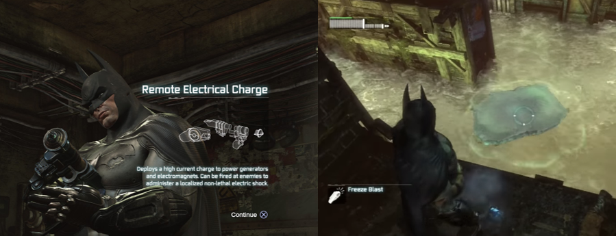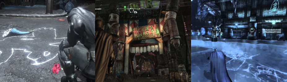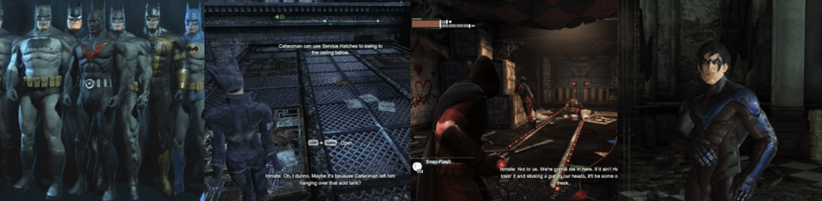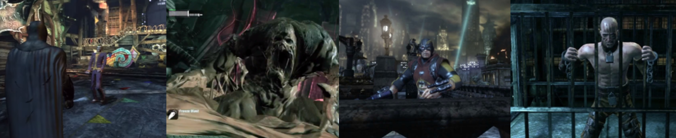As Batman progresses further into the prison, or to facilitate this progression, he must face some of his most memorable rogues…and also Benjamin Turner/Bronze Tiger and Floyd Lawton/Deadshot…in boss battles that range from simplistic to ridiculously frustrating. First, you’ll chase Catwoman across the city’s rooftops to a construction site, then you must tap Y to evade her claw swipes and press B to stun her with your cape when prompted. If you try to attack any other time, she’ll slap or whip you away and you’ll need to be quick with your counters for the final hit as she swipes at you three times in slow-motion before going down and offering to help you out. As you explore the cell blocks, you’ll end up in a specially constructed electrified arena made for the Penguin’s amusement where you fight Bronze Tiger in a battle that’s functionally very similar to the one against Catwoman. You’ll initially need to counter Bronze Tiger’s attacks, stun him with your cape, and hit a quick combo but he also has a leaping attack that you must dodge to smack him up, and you can deal a fancy finish if your combo hits him into the electrified cage. As much as I mock him, Deadshot at least mixed up the challenge for his boss battle. Initially, you control Batman from the perspective of Deadshot’s sniper rifle, using cover to avoid being shot and making your way around the area. Then, he switches to a machine gun and will cut you down in seconds if you don’t duck down, meaning the timing to hit a nearby spotlight and blind him is very tight, but at least it wasn’t just counter/stun/attack/repeat.
