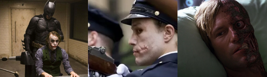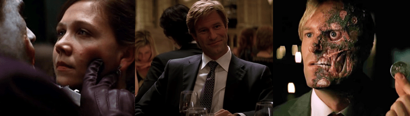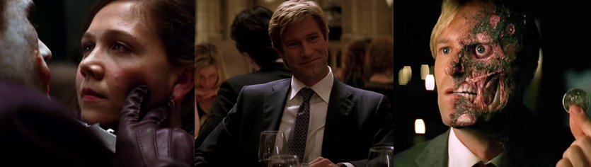 However, Batman’s positive impact, the arrest of hundreds of mobsters, and the public’s approval of Dent give Bruce pause to reconsider his path. Since the last film, Bruce has been keeping a close eye on childhood friend and crush (and assistant district attorney) Rachel Dawes (Gyllenhaal), who works closely with Dent to prosecute the criminals and the corrupt. Thanks to Gyllenhaal being a far superior actress to her predecessor, Rachel has much more gusto this time around. She exudes a confidence and determination that was lacking in Katie Holmes’ performance and allows her to not only appear effective when interrogating Lau but also sees her fighting back against the Joker when he targets her at Bruce’s fundraiser for Dent. Although Bruce is clearly rattled by how close Dent and Rachel have become (the two are shown to be in a relationship) and somewhat condescending towards Dent’s marketing campaign, he’s as impressed by the D.A.’s conviction as the rest of the city. Dent is a square-jawed patriot who makes a buzz in the court room with his no-nonsense approach towards criminals and inspires the wealthy and the destitute alike with his commitment to justice. Dent is also an avid supporter of the Batman and determined to do whatever it takes to keep the city streets clean, even if just for six months, but he’s not as squeaky-clean as everyone believes. Gordon is sceptical of Dent due to his past in Internal Affairs, while Dent is highly critical of the corruption within the GCPD, but the two form an efficient trio alongside the Batman when they agree to pool their resources to bring Lau back from Hong Kong. Dent proves to be a surprisingly complex man. He believes so strongly in the iconography of the Batman and in not giving in to the Joker’s demands, no matter how many lives are at stake, that he publicly outs himself as the Dark Knight to keep the myth alive but also proves that he’s not above threatening criminals at gunpoint, showcasing an unexpectedly erratic side to his character. This is only exacerbated when Dent and Rachel are targeted by the Joker and Batman is forced to choose which one to save. Naturally, he picks Rachel but both he and Dent are horrified to learn that this was a double-cross that leaves Dent hideously scarred and despondent, his faith in both justice and the caped vigilante shattered and replaced by a cruel devotion to “chance”.