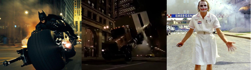 Speaking of Gotham, we’re shown a much different side of the city this time around. We’re firmly topside amongst the towering, glistening skyscrapers rather than in the dingy alleys of the Narrows, which is thematically relevant since the Joker is targeting the upper-class façade of the city but does rob it of a lot of its bleak, gothic identity. The Dark Knight also continues Batman’s crusade not against the street-level crime that killed his parents, but organised crime. He, Gordon, and Dent believe cutting the head off the proverbial snake will kill the body, and this is reflected after their big arrest that sees the lower-level scum facing at least six months in jail, giving the city breathing time to recover. However, this has the knock-on effect of reducing Batman’s street-level crimefighting to near zero since he’s more focused on nailing the likes of Maroni and the Joker and less on stopping random muggings and such. This isn’t necessarily a bad thing because, sadly, there’s little to no improvement in the fight scenes here. Nolan again opts for a close quarters, frenetic depiction of Batman’s fighting that does paint him as a brutal and efficient animal but robs us of seeing what he’s truly capable of. On the plus side, The Dark Knight explores Bruce’s detective skills; while it’s a bit confusing how he recreates fingerprints from bullet casings and he’s constantly one step behind the Joker, I liked how he colluded with Gordon and Dent to apprehend the mob and he’s given some fancy new toys to help him in these endeavours. The most prominent remains the tank-like Tumbler but, when this is destroyed by the Joker, Batman spends the remainder of the film blasting through the city streets on the sleek, bad-ass “Batpod”, a motorcycle-like vehicle that performs all kinds of unlikely turns and tricks with its near-spherical wheels, When extraditing Lau from his office building, Batman makes impressive use of his cape to soar through the skyline and then uses a “skyhook” to yank himself and his quarry out of there, just one of many impressive practical effects utilised in the film, with two more being the Joker’s insane truck flip and the fully practical, full-scale hospital explosion.