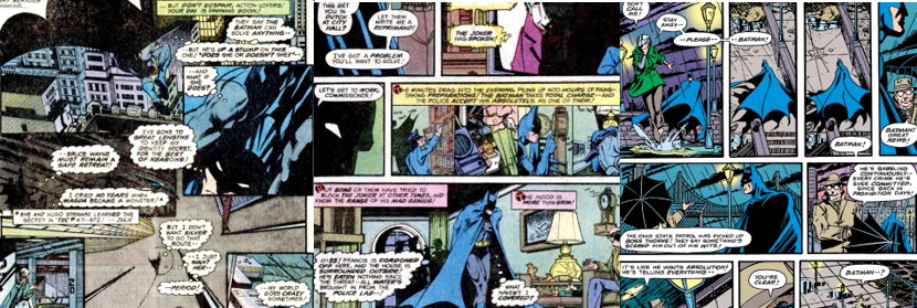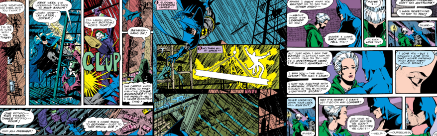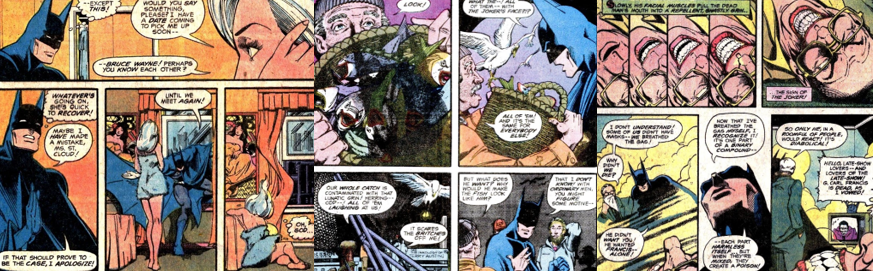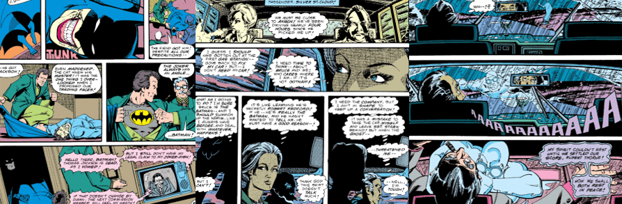 One aspect I really like about this time in Batman history is how much his detective skills are emphasised. Jim calls the Batman in as an advisor and immediately sets to work meticulously safeguarded each victim’s apartment, checking every inch for possible threats and desperately trying to prepare for every eventuality. Although his thoughts are shown to be completely focused on the task at hand, I think it’s pretty clear his frustration with the Joker’s antics is exacerbated by his personal issues with Silver. The Batman laments time and again that the Joker is nigh-impossible to predict as he just does whatever he wants for seemingly no reason, meaning Batman’s preparation and planning are meaningless as the Joker outwits him each time. Even swapping places with Jackson doesn’t help the Batman, and it’s only by utilising the analyser left for him by Strange’s ghost (or some other unknown ally) that Batman exposes the Joker’s disguise before he kills his last victim. The battle between the Batman and the Joker is depicted as a war of attrition, a game of one-upmanship, rather than a physical confrontation (at least, until the end). Like in his first appearance, the Joker hijacks television broadcasts to make threats and taunt his foe, and employs disguises and subterfuge to bamboozle even the World’s Greatest Detective. One thing I especially enjoyed here was that Bruce Wayne doesn’t appear in these stories. His personal life is of great concern to Batman, but he stays in costume throughout both issues, emphasising his unwavering focus on protecting the Joker’s victims and apprehending him. Another interesting aspect is, like in his first appearance, the Joker surprisingly holds his own against Batman thanks to being a slippery devil and surprising him with his acid flower, wild kicks, and daredevil nature.
