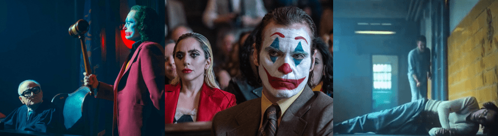 Despite some confusion in the marketing and various interviews, Joker: Folie à Deux is very much a musical. Even before Arthur meets Lee, his fantasies favour belting out Frank Sinatra and, after they get closer, this only increases, to the point where almost every conversation becomes a musical number. I like musicals; I’m not against the idea of a musical. I like the idea that Arthur’s warped imagination has evolved to where he retreats into musical fantasy. However, I don’t think it was executed well here and it became very tedious. It seems the only reason these musical numbers is because of Lady Gaga’s stunt casting as Harley Quinn (sorry, “Lee”), and I definitely feel it would’ve been more impactful to just have three or four of these numbers. Indeed, it bothered me that Arthur was suddenly so into singing when surely his fantasy should be being a stand-up comedian or a talk show host like his former idol? Either way, it was physically exhausting seeing mundane conversations turned into songs and it got tired very quickly. While the first half of Joker: Folie à Deux mostly examines a beaten-down Arthur as he shuffles through daily torment in Arkham and his blossoming relationship with Lee, the second half is a courtroom drama, where Arthur’s very presence causes controversy even before he’s prancing around in his clown makeup. Personally, I found the courtroom stuff more interesting, but it was also a joke. The idea that anyone would acquit Arthur when thousands of people saw him commit murder on live television is laughable, to the point where Dent seemingly only endures the circus to bolster his career using the publicity. Things seem to turn a corner when Arthur represents himself as Joker, finally standing tall as a taunting, unhinged figure and stirring up a fresh wave of support from the incels who worship him as a martyr. However, beneath the makeup and the façade is lowly old Arthur Fleck, a damaged man who struggles to live up to expectations. Dent argues that Arthur is faking his mental illness and Arthur’s brief euphoria at reassuming his Joker guise soon comes crashing down following Jackie’s assault, leading him to openly denounce his persona, admit to his wrongdoings, and essentially criticise not just those who support him, but the myriad audiences who hailed Joker a subversive hit.