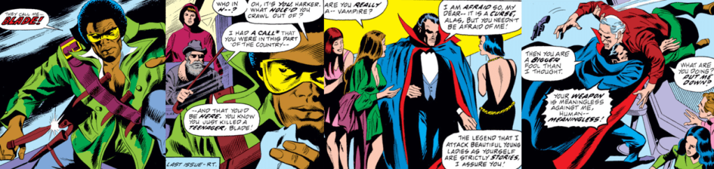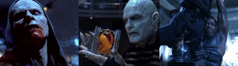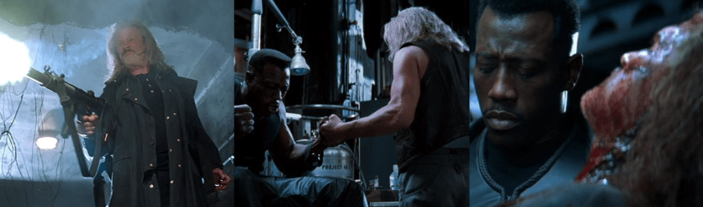 Things start out normal for everyone’s favourite dhampir as he knocks off vampires and operates out of a repurposed garage/warehouse much like in the first movie. Blade is oddly baffled when a victim shrugs off silver, despite claiming to have killed 1182 Familiars, and being easily fooled by fake fangs despite his heightened senses. This costs him when bystanders witness him killing a man in cold blood and Danica Talos (Parker Posey) releases the footage, painting Blade as a psychopathic murderer and exposing him to the Federal Bureau of Investigation (F.B.I.), specifically Agent Ray Cumberland (James Remar). While Blade’s mentor and father figure, Abraham Whistler (Kris Kristofferson) returns, he’s little more than a cameo who encourages Blade to rely on others and dramatically sacrifices himself holding off Cumberland’s strike team. The normally stoic dhampir is once again anguished by the loss, which further undermines his unnecessary return in Blade II. Much of Blade’s exchanges with Whistler set up his central character arc, namely his reluctance to rely on others or accept help (which is also a bit odd considering he worked with others, and even a vampire crack squad, before and Blade II painted him as a natural leader). Though Blade openly scoffs at the idea of having friends or relying on others, Drake’s threat forces him to fall in with the Nightstalkers, who Whistler secretly organised to aid him (despite them not appearing the last time Whistler died).