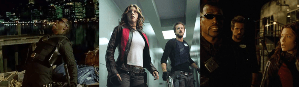 The Nightstalkers are an eclectic bunch of young upstarts who immediately rub Blade the wrong way, with wise-cracking Hannibal King (Reynolds) particularly grating on Blade’s nerves due to his motor mouth. Despite Blade’s very aggressive and unapologetic scepticism, though, the Nightstalkers sport state of the art tech and weapons, such as Abigail “Abby” Whistler’s (Biel) ultraviolet bow and Sommerfield’s (Natasha Lyonne) “Daystar” pathogen to wipe out the vampire species (which is doubly impressive considering she’s blind). Abby and Hannibal join Blade as the titular “trinity”, leaving Blade stunned to learn that Whistler had a secret daughter. While we never learn how close she and her father were, it’s clear she’s as haunted by her past and driven by revenge like Whistler, who wanted to destroy all vampires for torturing and killing his family. While Blade reluctantly becomes a key figure in the Nightstalkers, he also becomes a mentor for Abby, teaching her to “use” her pain and anger at the death of her friends to better aid her in battle, though she impresses with her speed and deftness and her ability to fight while listening to music. Hannibal’s fast talking, smarmy attitude clashes with Blade’s reserved personality, leading to the dhampir all-but dismissing King despite him formally being Danica’s plaything. This gives him all the motivation for hating vampires and wanting to wipe them out, something Blade can definitely relate to, though he remains adamant that the Nightstalkers need an attitude adjustment and some proper, experienced leadership. Hannibal may be a shit-talker, but he’s both extremely cut and loyal, insulting sadistic brute Jarko Grimwood’s (Triple H) manhood and bravely defying Danica, but he’s terrified of being turned back into a vampire and forced to feed his loved ones.